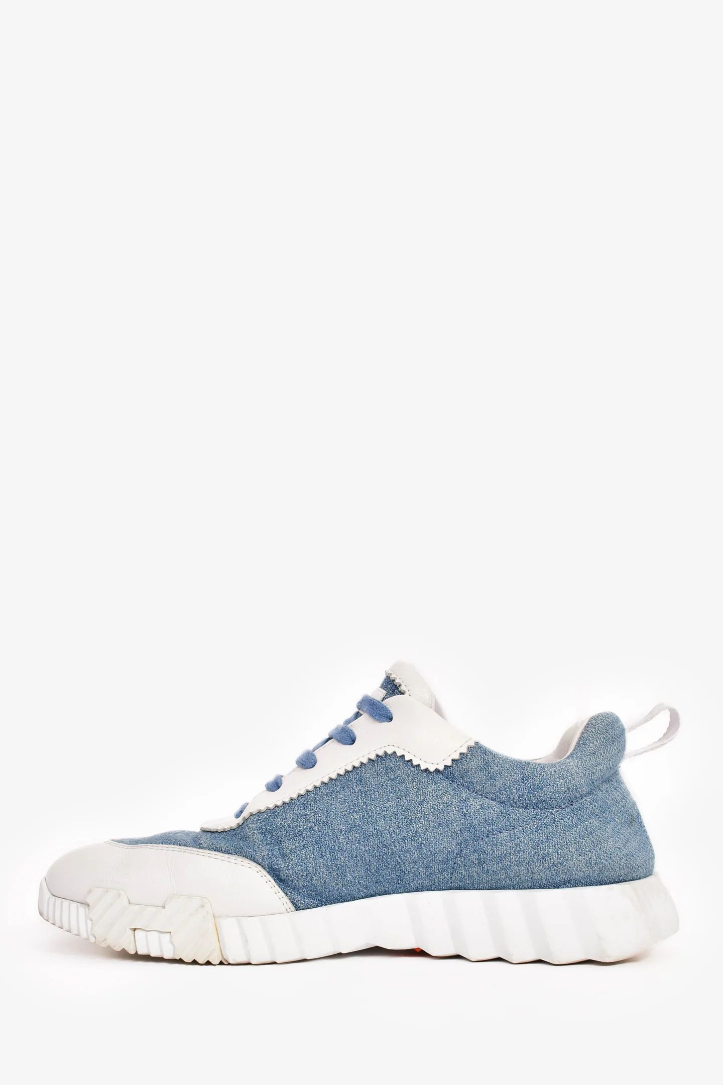 Hermès Blue/White Denim/Leather H 'Bouncing' Sneakers. Round toe. Lace-up closure. Denim exterior. Rubber soles. Leather trim and insoles. Tonal stitching.