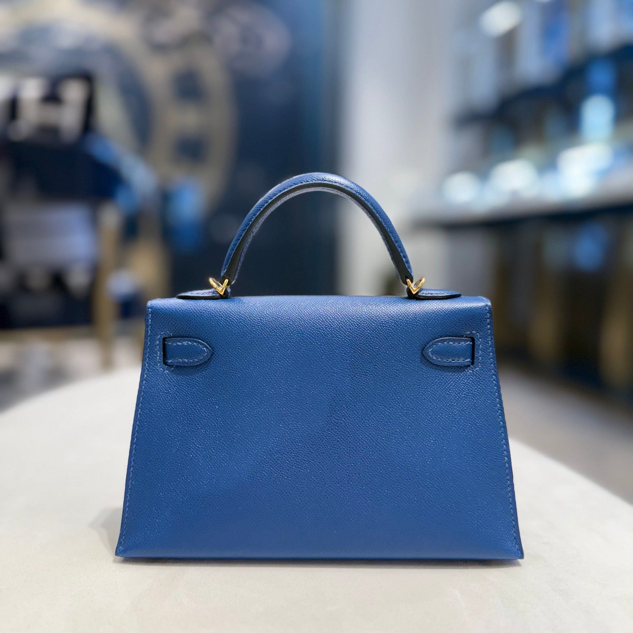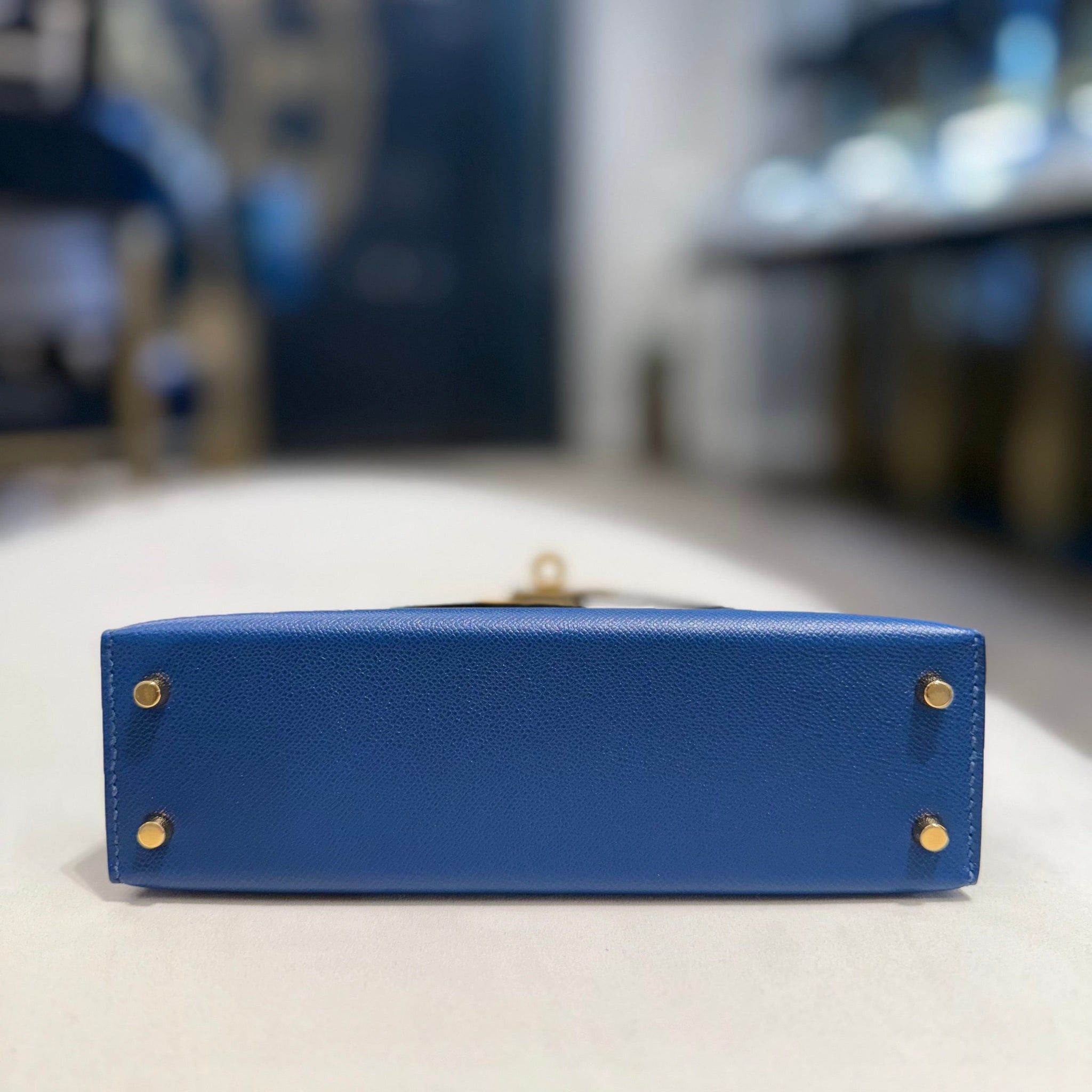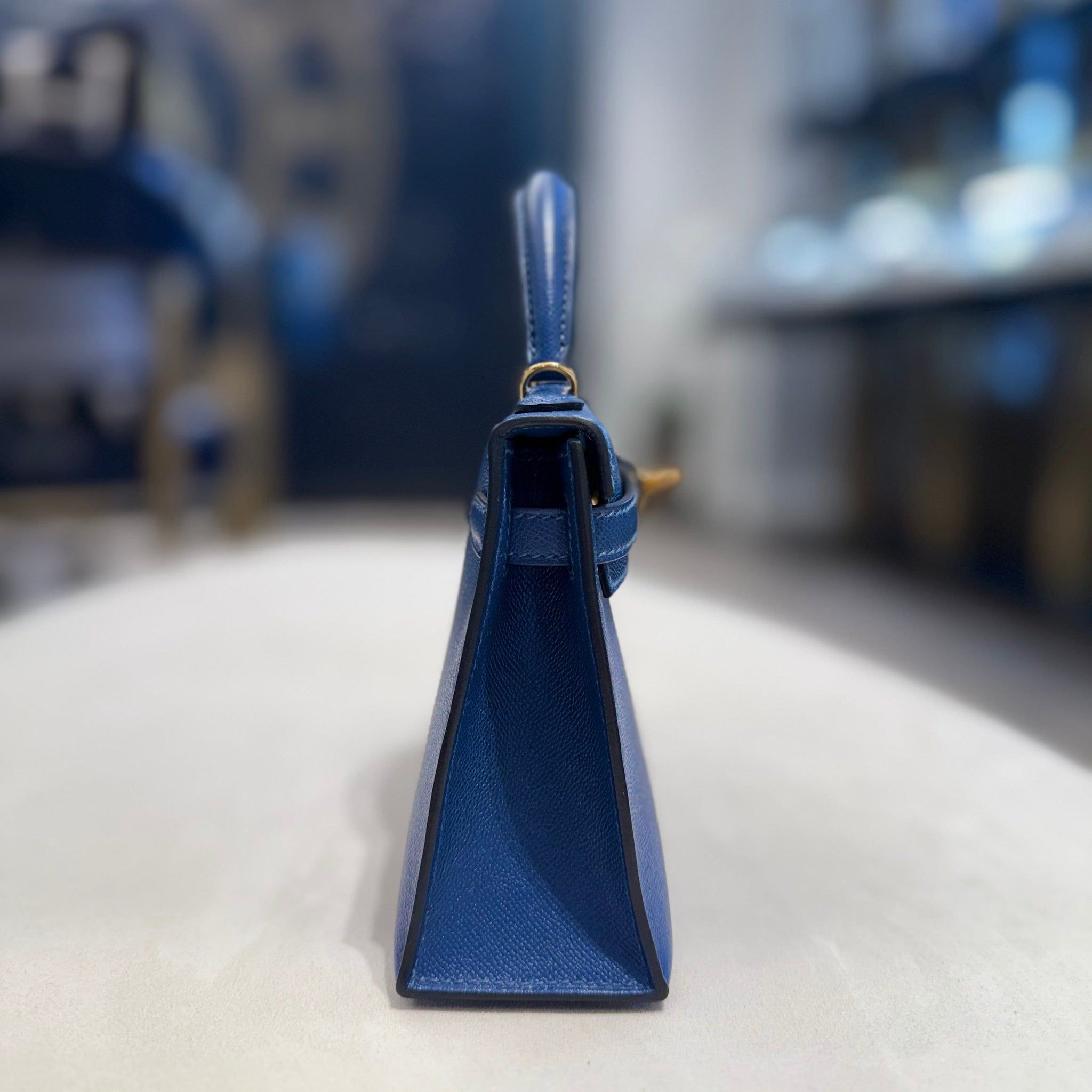 The Deep Blue shade—rich, regal, and endlessly versatile—complements the crisp lines of the Mini Kelly and is beautifully accented by Gold Hardware (GHW), enhancing its allure with a warm, luxurious glow.