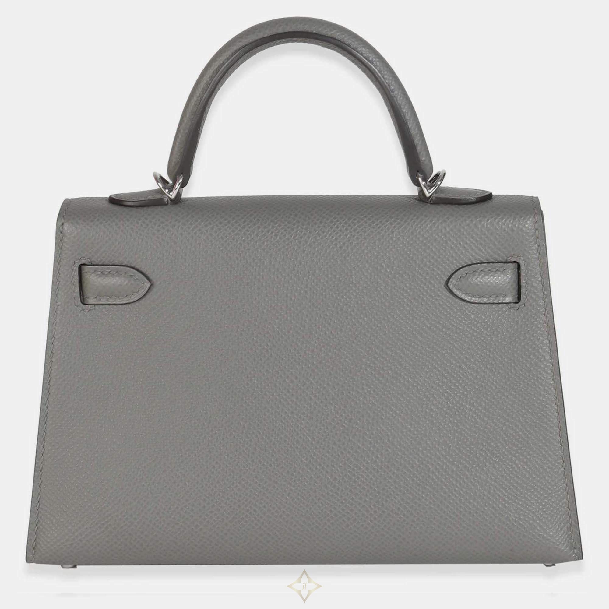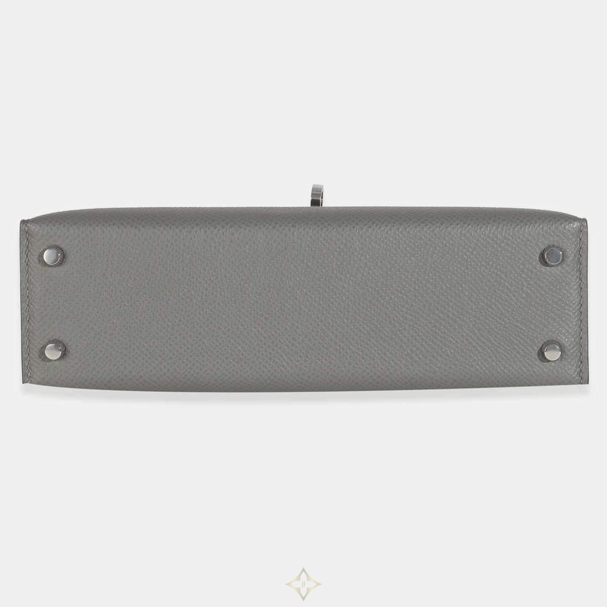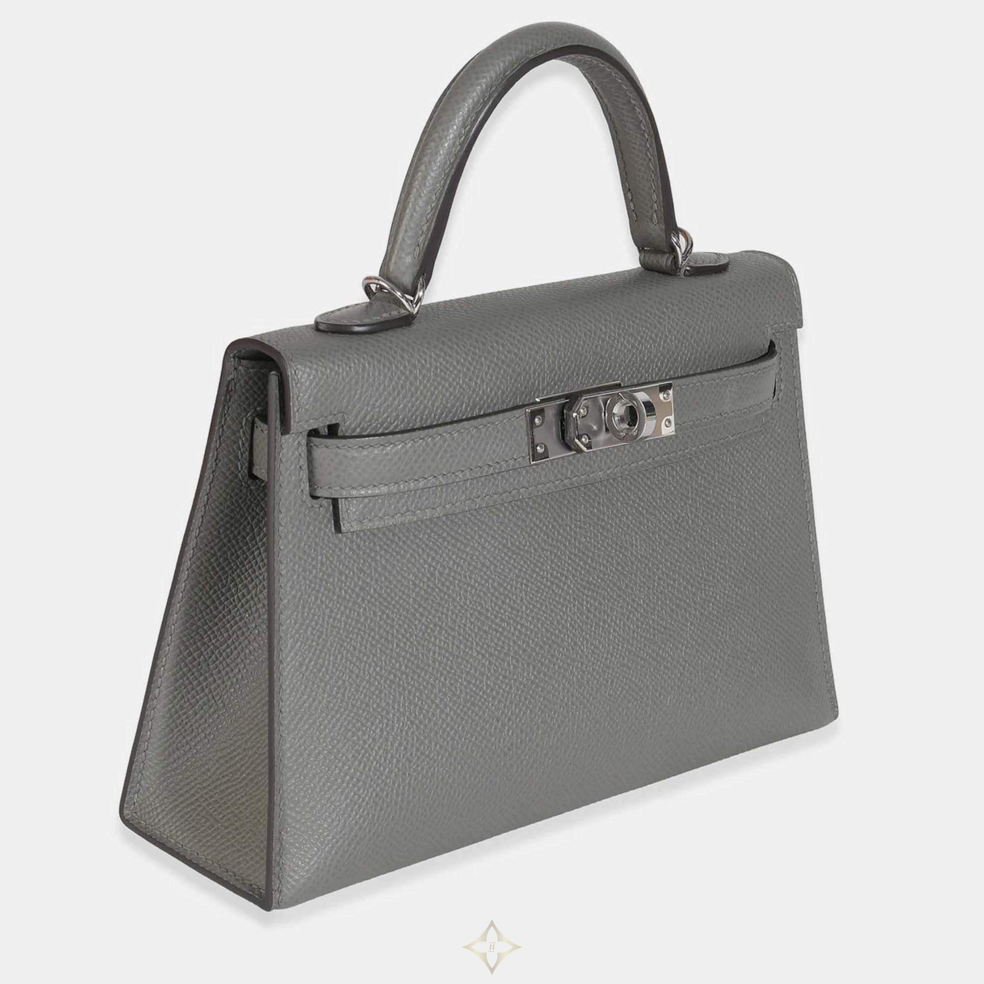 The Gris Meyer Mini Kelly II 20 in Epsom leather offers a serene, versatile grey tone. Hermès’ Sellier craftsmanship and polished SHW detail combine to create a petite bag that radiates both elegance and collectible appeal.