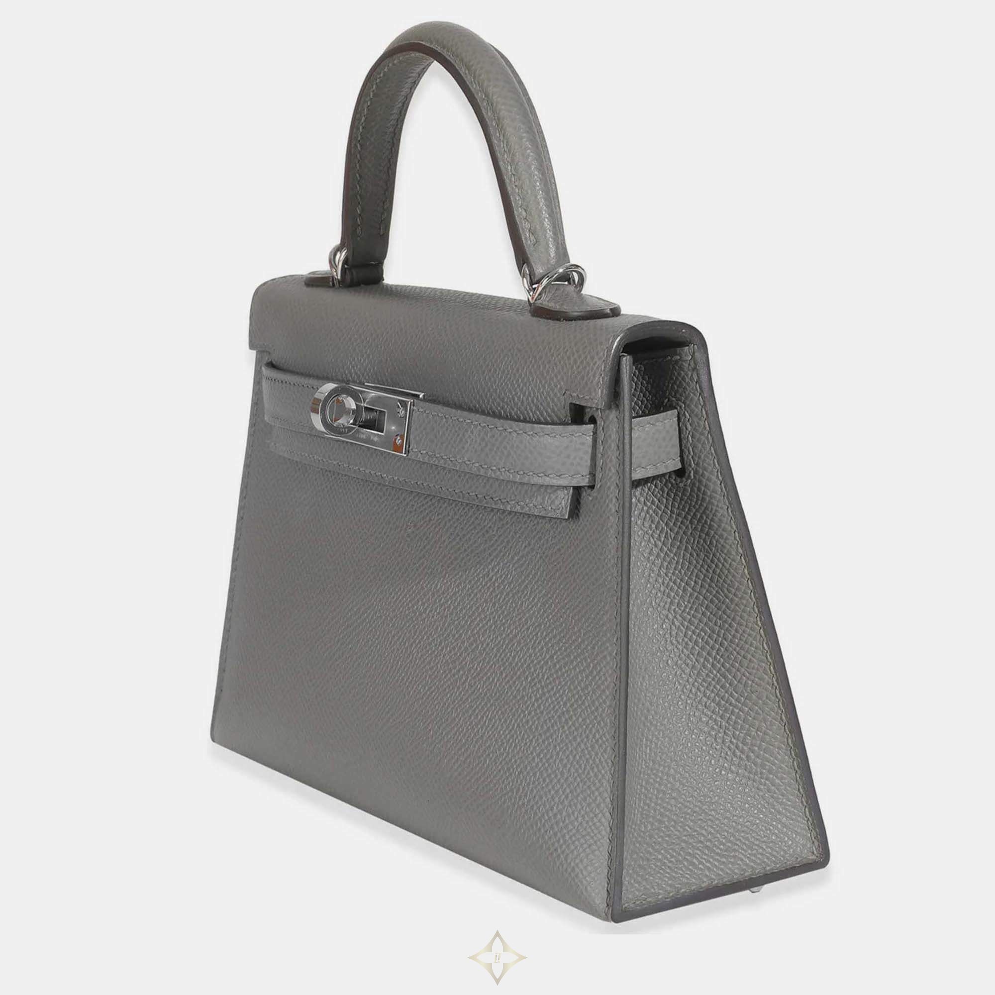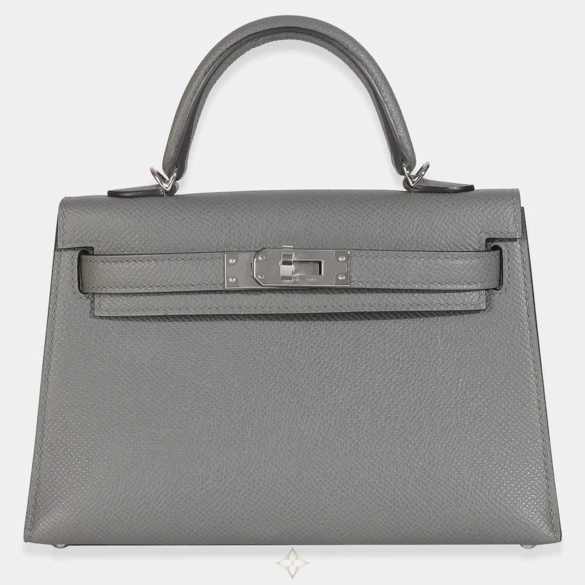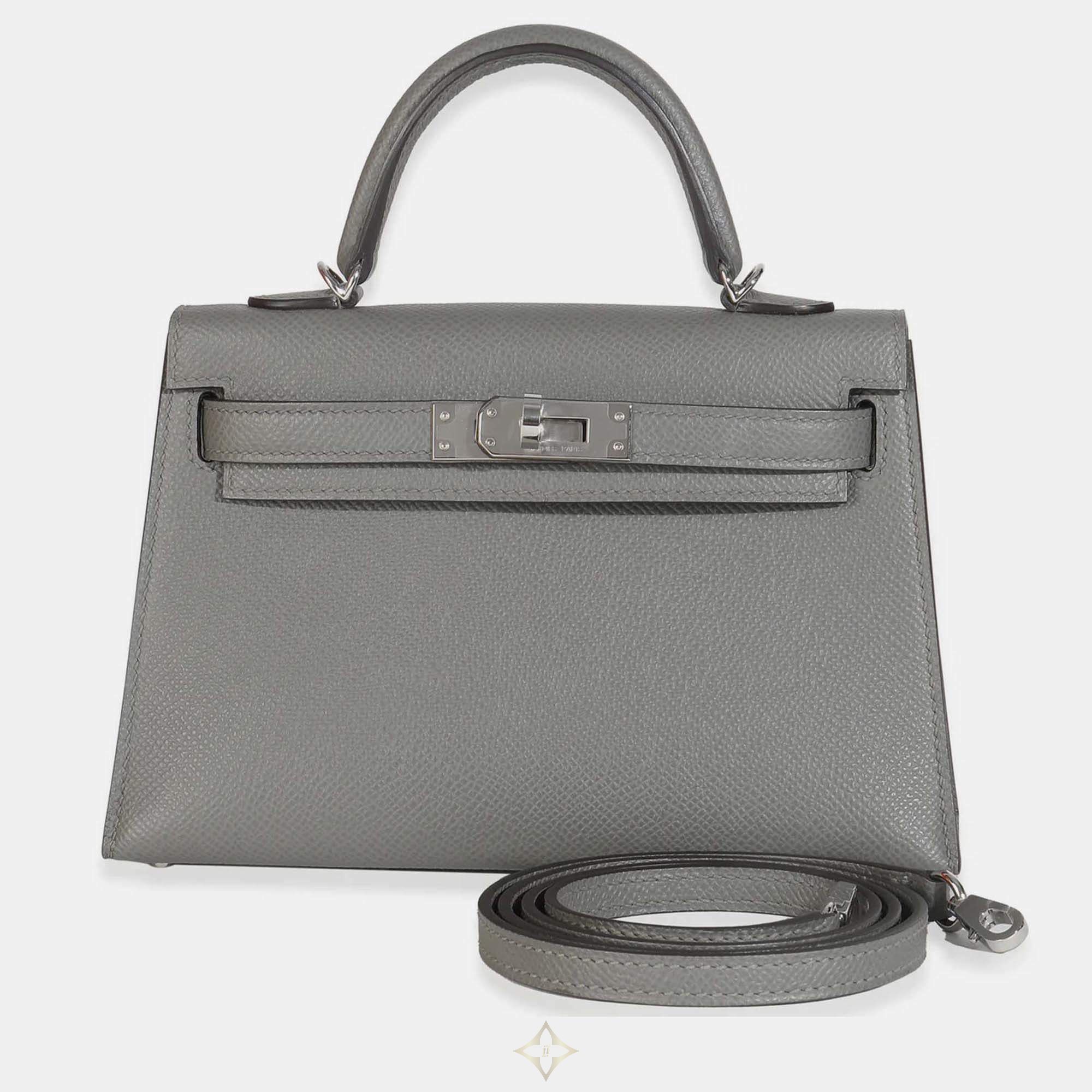 The Gris Meyer Mini Kelly II 20 in Epsom leather offers a serene, versatile grey tone. Hermès’ Sellier craftsmanship and polished SHW detail combine to create a petite bag that radiates both elegance and collectible appeal.