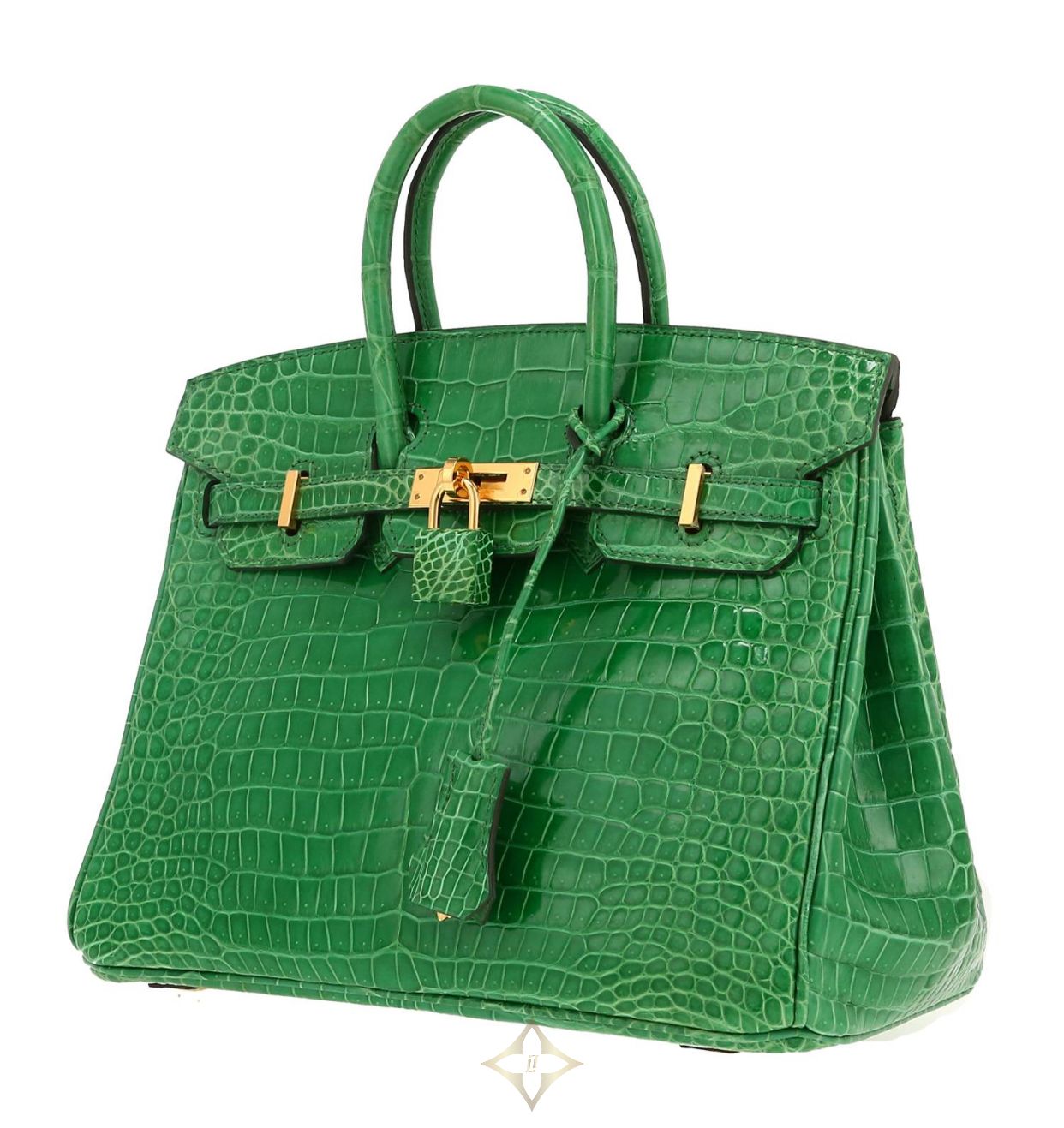 Hermès Birkin 25 cm handbag in Vert Cactus porosus crocodile Collector Square Ref: 41 50 58 Price: $ 62,880 Condition : Very good condition Collection : Birkin Model : Birkin 25 cm Gender : Ladies Year : 2020 Color : Green Material : Crocodile Length : 24 cm Height : 20 cm Width : 14 cm Category : Handbag Wonderful Hermès Birkin 25 cm handbag in Vert Cactus porosus crocodile, hardware in gilt metal, double handle in Vert Cactus porosus crocodile allowing the bag to be worn in the hand. Flap fastener. Lining in Vert Cactus leather, one zip pocket, one patch pocket. Sold with tirette, keys, padlock trimmed with leather, clochette, dustbag, its CITES. Signature: "Hermès Paris Made in France " . Hidden stamp: Y (2020). Very good condition: nice color, very good condition inside, micro signs of wear on the corners of the bag. The commercial use of this specimen is free within the EU (Annex 2B of the Washington Convention). However, to leave the EU, a CITES re-export permit is requested. Collector Square SHOWROOM PARIS 36 Boulevard Raspail, 75007 Paris, France SPACE AT LE BON MARCHÉ 24 Rue de Sèvres, 75007 Paris, France Phone: +3314634 35 30 What's App : +33 (0)6 24 26 13 20 Email: contact@collectorsquare.com