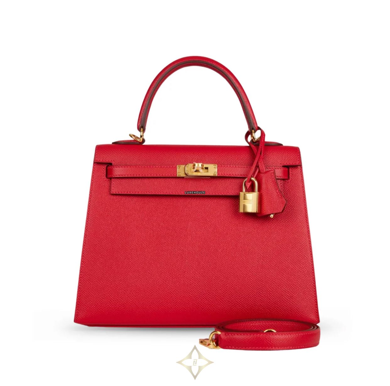 The Hermes Kelly 25 Rouge Casaque Epsom Sellier GHW X is a sellier-style bag crafted from Epsom leather in Rouge Casaque—a bold, dense, and radiant shade of red—featuring gold hardware and marked with an X stamp (2016). It features tonal stitching, a front flap, two straps with a center toggle closure, a clochette with a lock and two keys, a single rolled handle, and an optional shoulder strap. The interior is lined with Rouge Casaque Chevre leather and includes one zip pocket with an Hermes-engraved pull and one open pocket on the opposite side.