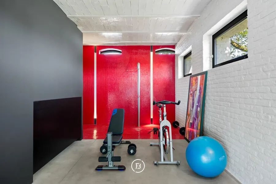 In 2010, the left wing underwent a complete renovation. This building is perfectly suited as an office, practice, or multifunctional space. It currently includes a cozy lounge with an open fireplace, an open kitchen, a storage room, cloakroom, bathroom, and a fitness area. On the upper floor, there is space for an office or two comfortable bedrooms.