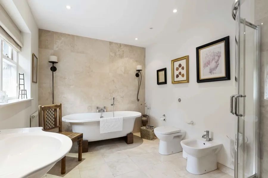 Improvements have been made to the house creating four double bedrooms and three very generous bathrooms with bath tubs and a separate shower stall. The bathrooms are beautifully appointed travertine tiles walls and floors and quality sanitary fittings. All the bedrooms offer built in wardrobes with a range of Hulsta built in units.
