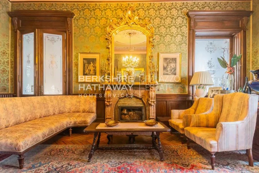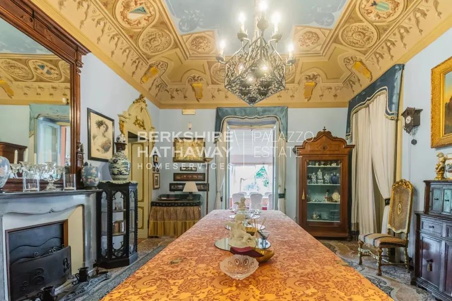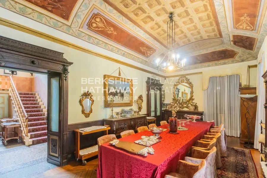 The castle features 27 rooms, including grand halls adorned with frescoes and Venetian terrazzo floors, and a bright salon with a veranda overlooking the garden.