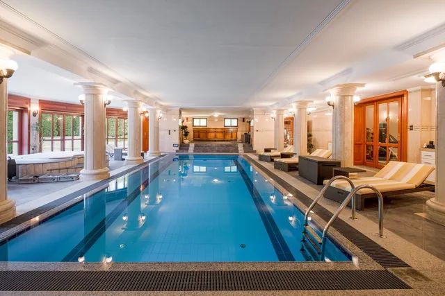 On the lower level, residents can enjoy a full wellness area, including a fitness room, sauna, indoor swimming pool, and relaxation spaces, along with a garage and dedicated staff quarters.