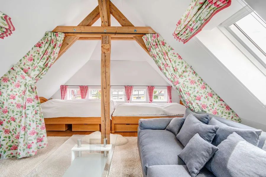 The top floor has two levels. We admire two living/sleeping rooms, a large bathroom with a whirlpool bath, an attic room with a shower room and WC, before climbing the stairs to the tower room and from there to the Söller, the highest point of the house. From here you can enjoy the view as far as the Alps.
