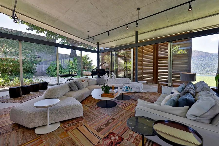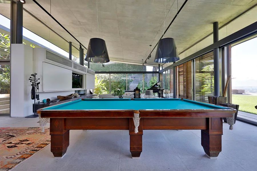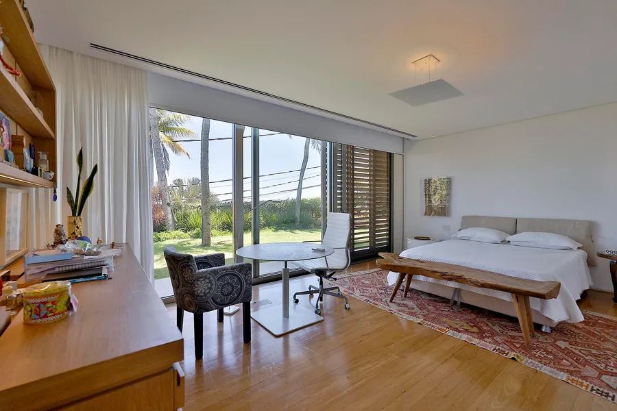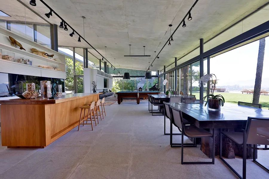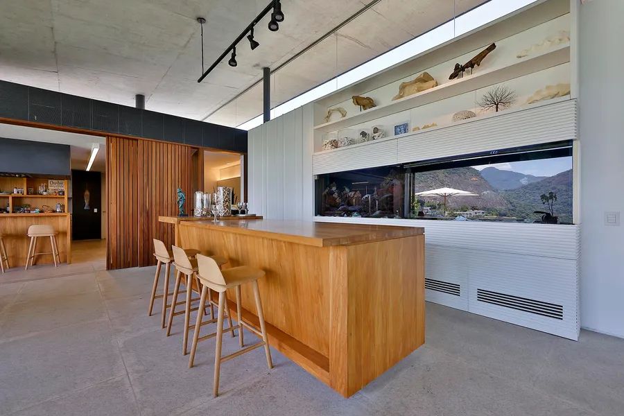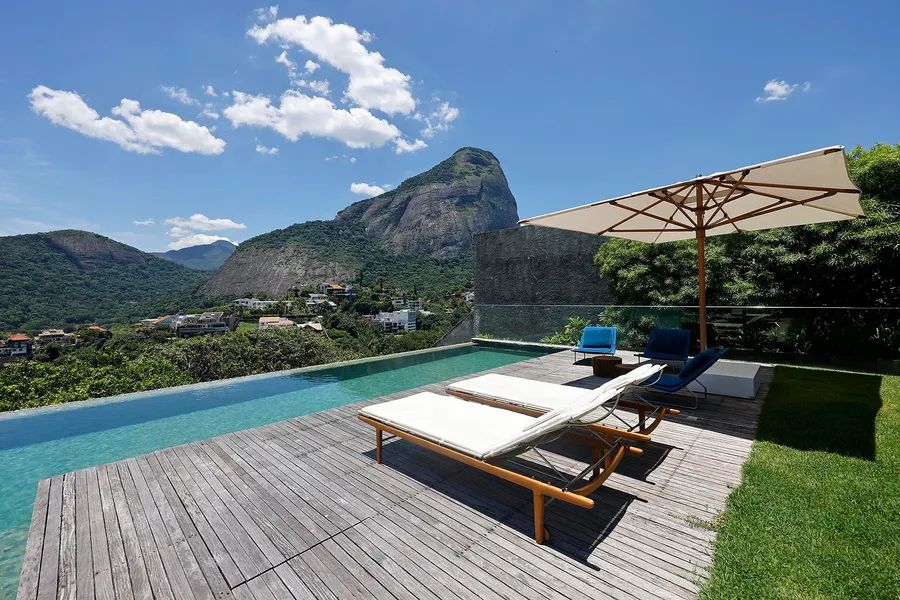 House in Joatinga, designed by Thiago Bernardes, an architect from Rio de Janeiro. The property consists of 3,440 square meters of land surrounded by cinematic landscapes and wide views, with a house divided into two floors. The first floor consists of an entrance hall, a living room and a dining room with high ceilings and plenty of light, in addition to a large aquarium, a bar area, a pool table, a half bath, a gourmet kitchen and a laundry area. The landscaping that surrounds the entire living area brings a lot of harmony to the spacious rooms. On the second floor there are five generous bedrooms with en-suite bathrooms and closets, as well as a family room, a deck and a balcony overlooking the greenery. The outdoor area features a quartz stone infinity edge swimming pool, a vegetable garden, a dog kennel, a gym, dry sauna and wet saunas, a hot tub, a games room and large clay tennis court. There is parking for six cars.