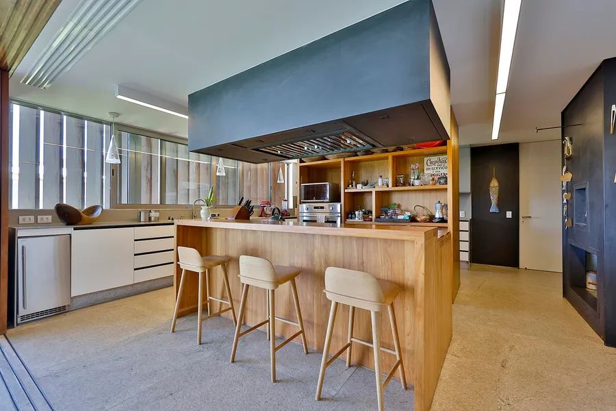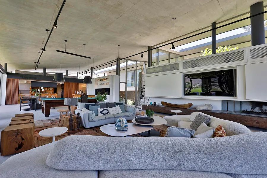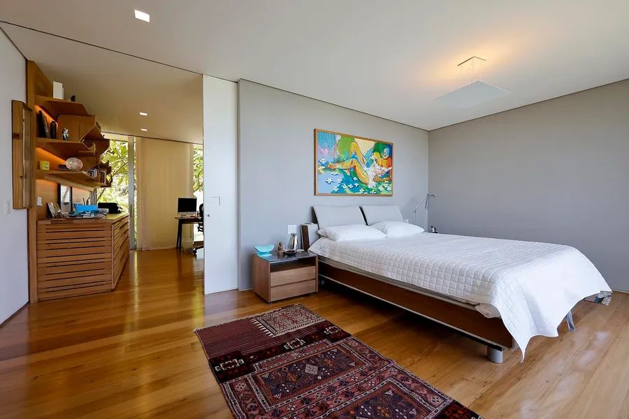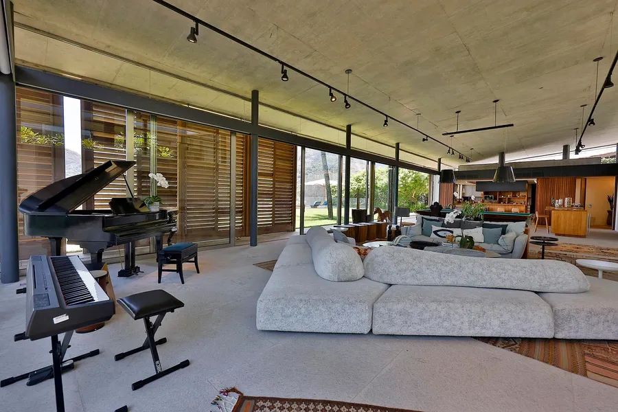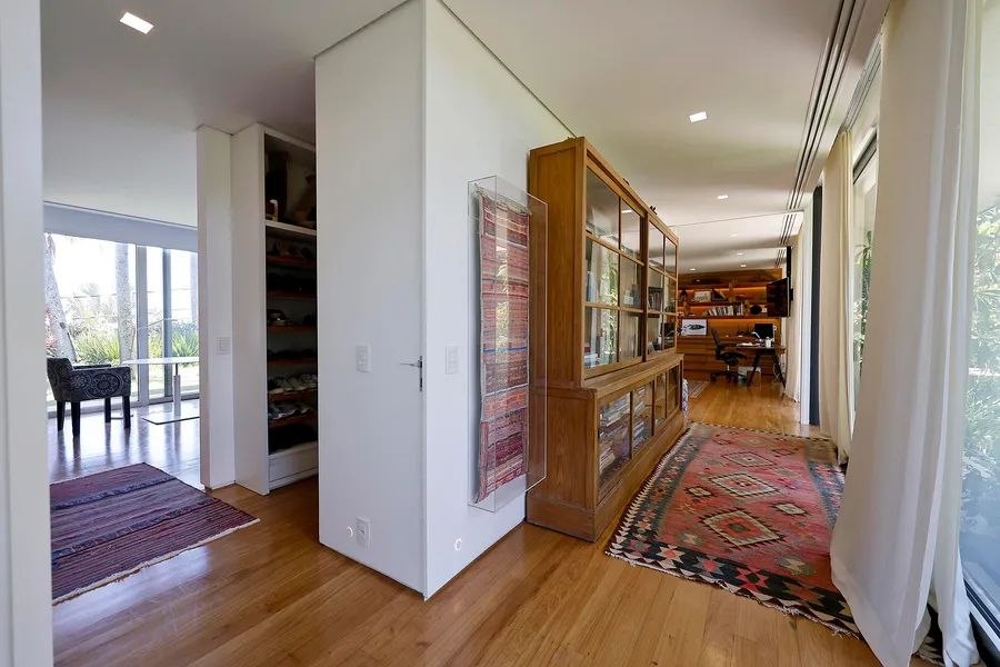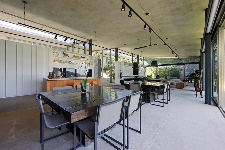 House in Joatinga, designed by Thiago Bernardes, an architect from Rio de Janeiro. The property consists of 3,440 square meters of land surrounded by cinematic landscapes and wide views, with a house divided into two floors. The first floor consists of an entrance hall, a living room and a dining room with high ceilings and plenty of light, in addition to a large aquarium, a bar area, a pool table, a half bath, a gourmet kitchen and a laundry area. The landscaping that surrounds the entire living area brings a lot of harmony to the spacious rooms. On the second floor there are five generous bedrooms with en-suite bathrooms and closets, as well as a family room, a deck and a balcony overlooking the greenery. The outdoor area features a quartz stone infinity edge swimming pool, a vegetable garden, a dog kennel, a gym, dry sauna and wet saunas, a hot tub, a games room and large clay tennis court. There is parking for six cars.