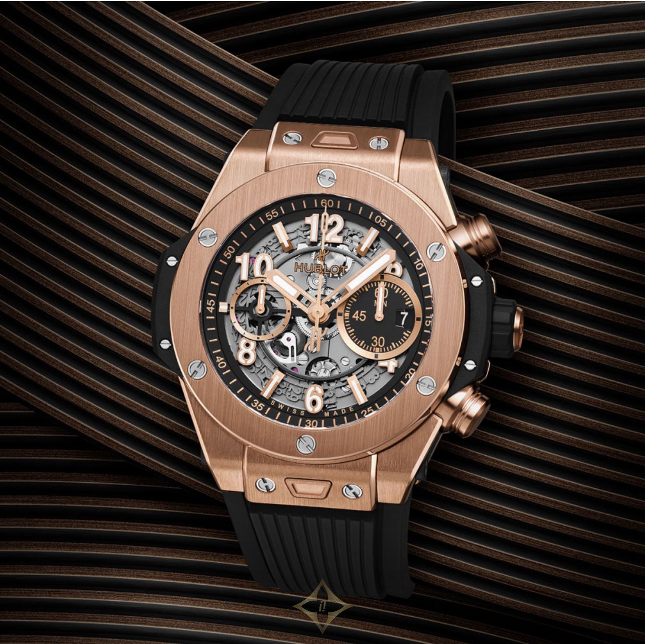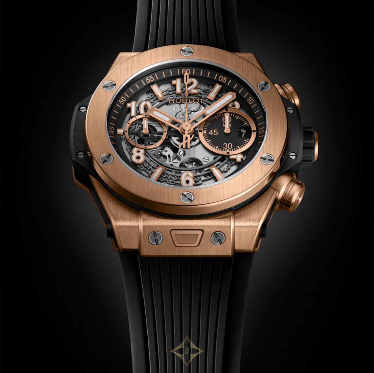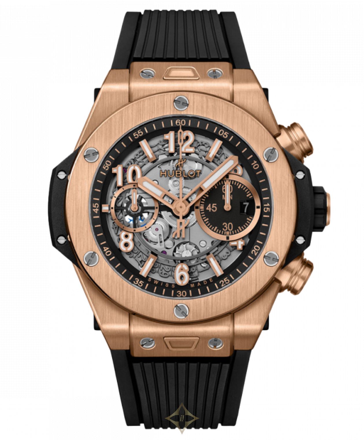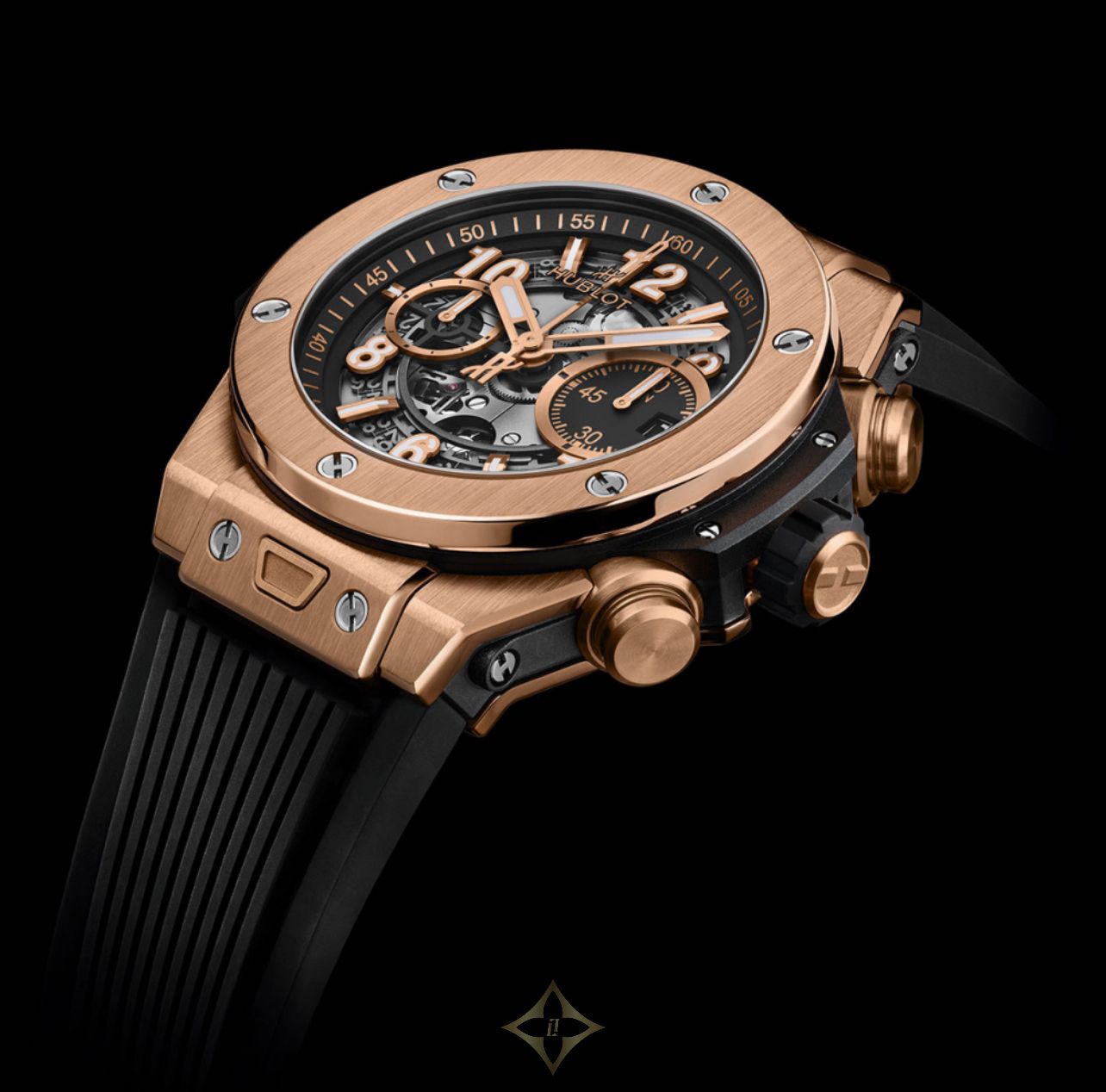 Hublot Big Bang Unico King Gold Watch 44mm 421.OX.1180.RX. Polished and Satin-finished 18K King Gold case with sapphire crystal with anti-reflective treatment and HUBLOT logo printed on the inner side. Black Composit Resin Bezel Lug and Lateral Inserts. Satin-finished 18K King Gold lower bezel with Sapphire Crystal Interior and Anti-reflective Treatment. Black Rubber satin-finished 18K King Gold crown with satin-finished and 18K King Gold pushers and Titanium Screws. Matt Black Dial and Gold-plated Upper Layer Indexes with White Luminescent - Satin-finished and Microblasted Gold-plated Hands with White Luminescent. Black Structured Lined Rubber Strap with Black PVD Titanium with 18K King Gold Insert Deployant Buckle Clasp. Water resistant to 10 ATM. Complete with 2 year manufacturers warranty and official Hublot packaging.