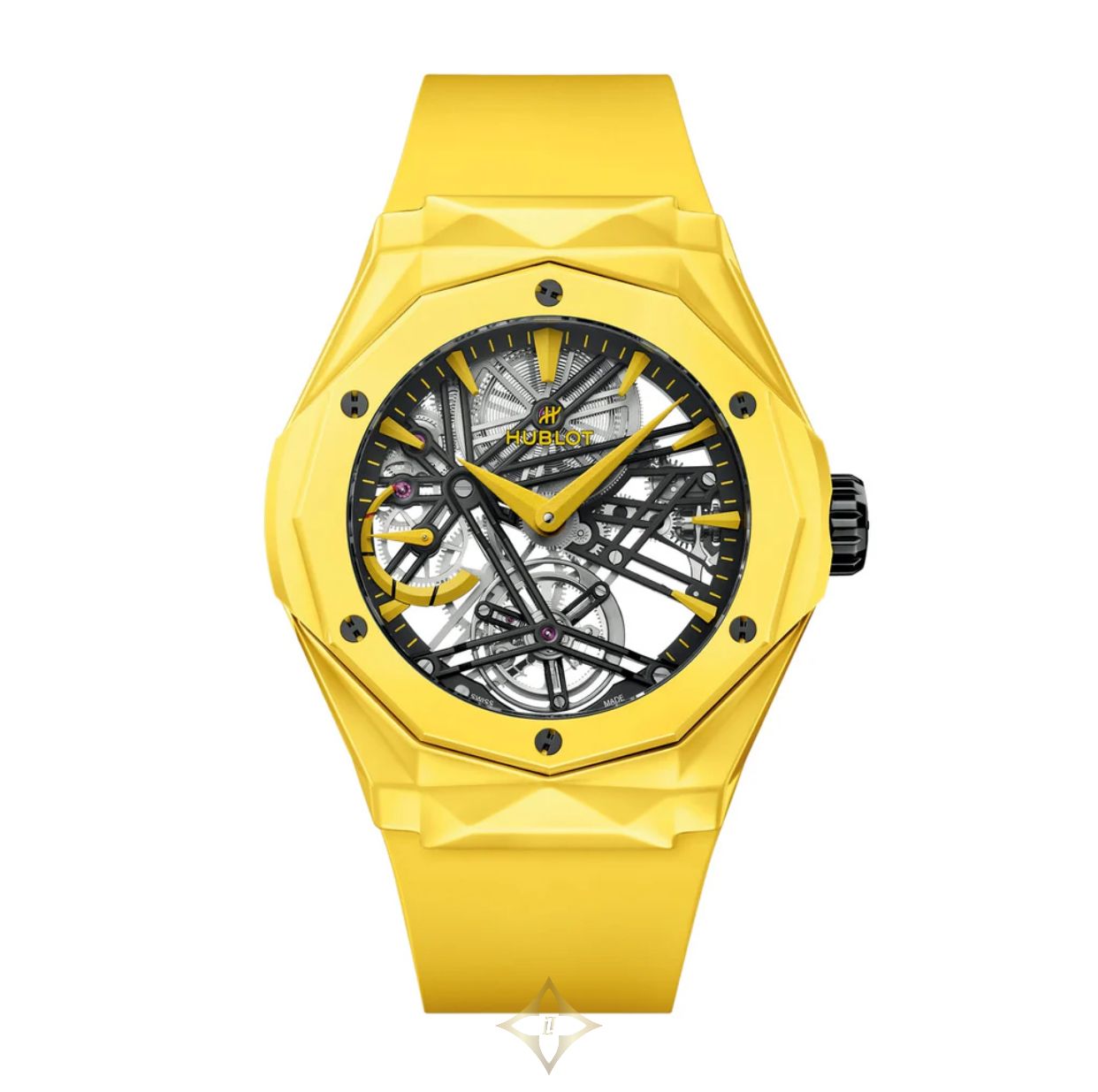 Hublot Classic Fusion Tourbillon Orlinski Yellow Magic in a 45mm yellow ceramic case with skeleton dial on rubber strap, featuring a tourbillon display, power reserve indicator and manual wound movement with approximately 105 hours power reserve. Limited edition to 30 pieces.