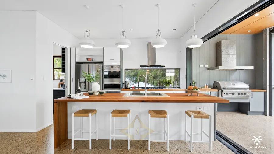 - Modern Coastal Kitchen designed for entertaining with high end custom cabinetry complimented by the 100-year-old reclaimed St Kilda Pier timber benchtops, offering 900mm gas cooking and chefs wall oven with tinted glass feature window splash back walk in butler’s pantry and breathtaking views of the Palm Trees and Beach.