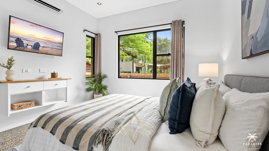 - Beach Front Owners Suite with raised private balcony and tinted sliding glass doors providing uninterrupted ocean views and incredible sunrises, with electric remote-controlled privacy blinds, polished concrete floors with deep walk-in dressing robe