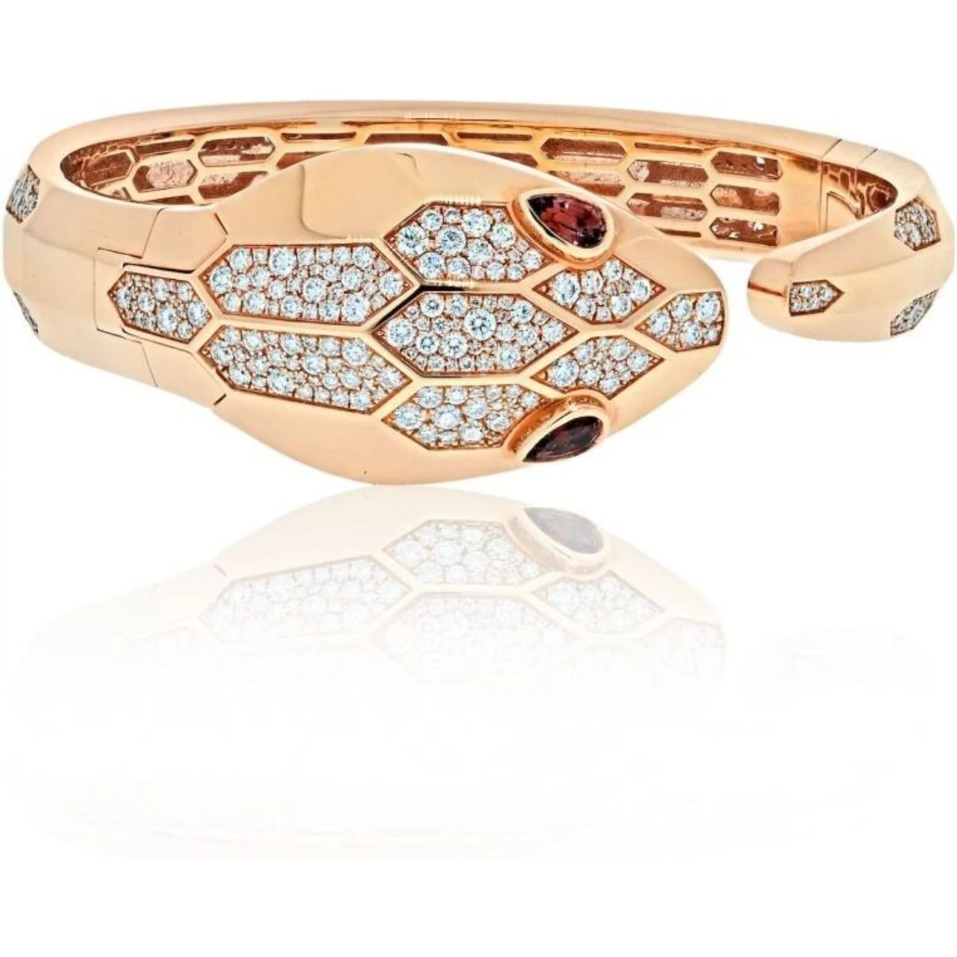 Sophisticated and glamorous, the timepiece coils around the wrist striking with the precious beauty of the scales and with the mesmerizing power of the snake's rubellite eyes.