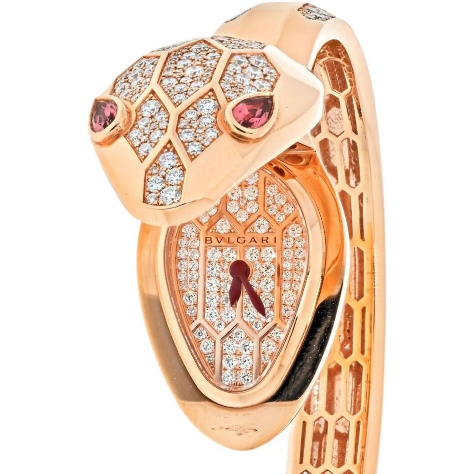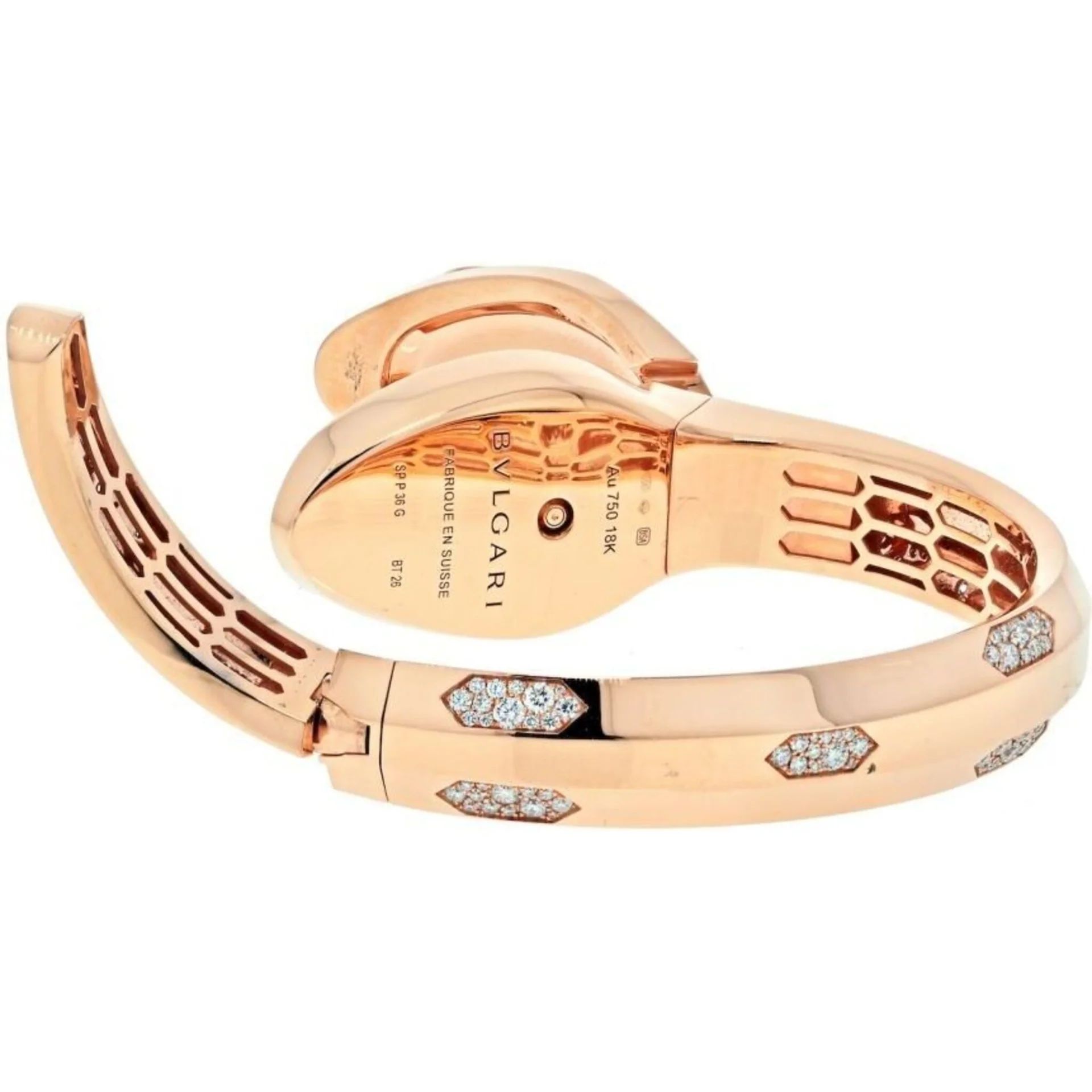 Inside the intricate case, you'll find a Bulgari quartz caliber movement, ensuring precise and reliable timekeeping. The dial, crafted in rose gold and adorned with a mesmerizing diamond pavé , adds an extra touch of opulence. The watch comes with an 18-karat rose gold bracelet, also embellished with diamonds, completing the harmonious and luxurious aesthetic.