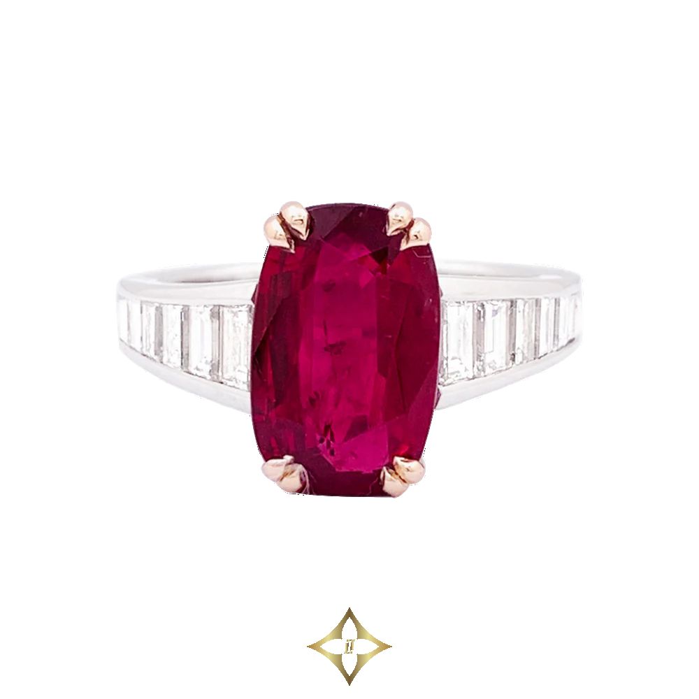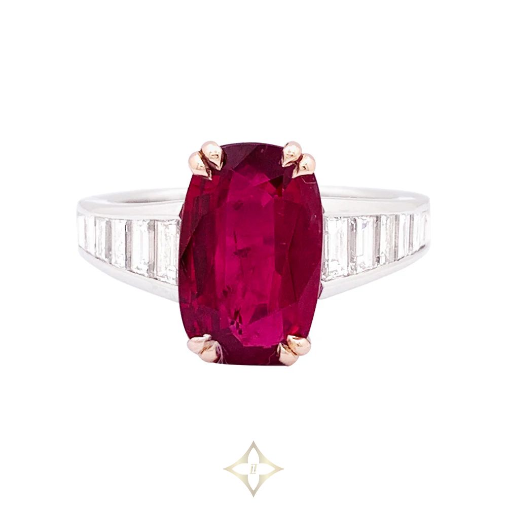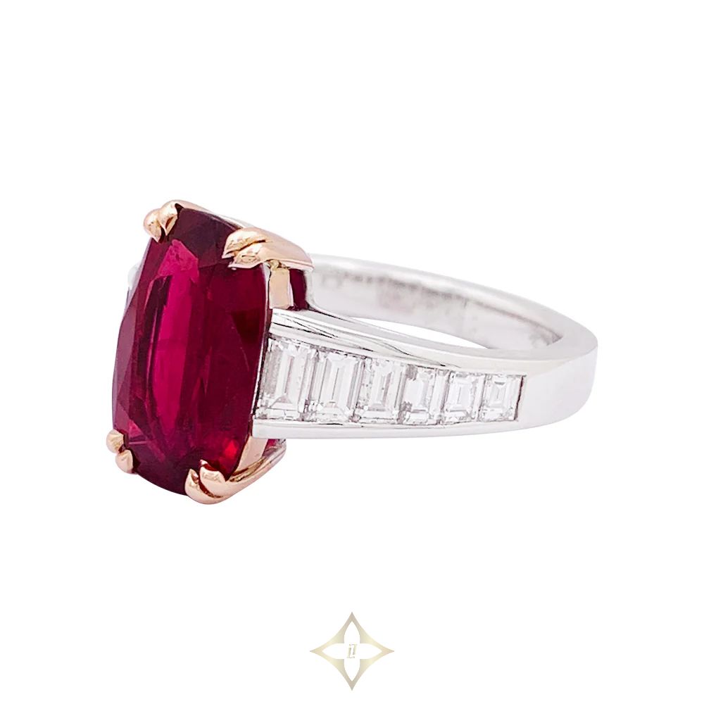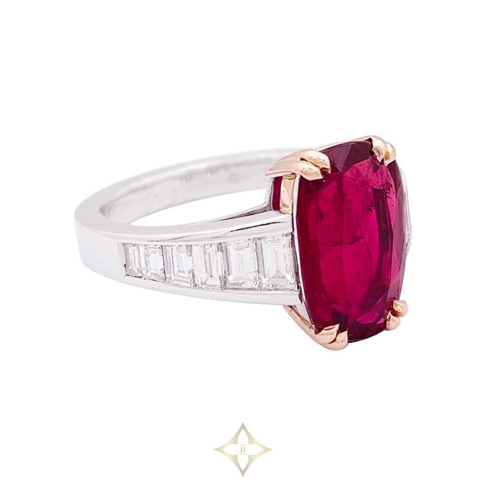 A ring in 750/000 white gold and yellow gold set with a 5.339 ct faceted oval ruby supported by two lines of baguette-cut diamonds for approximately 0.9 carats. SSEF Certificate: Siam / Heated. Estimated diamond quality: GH / VS.