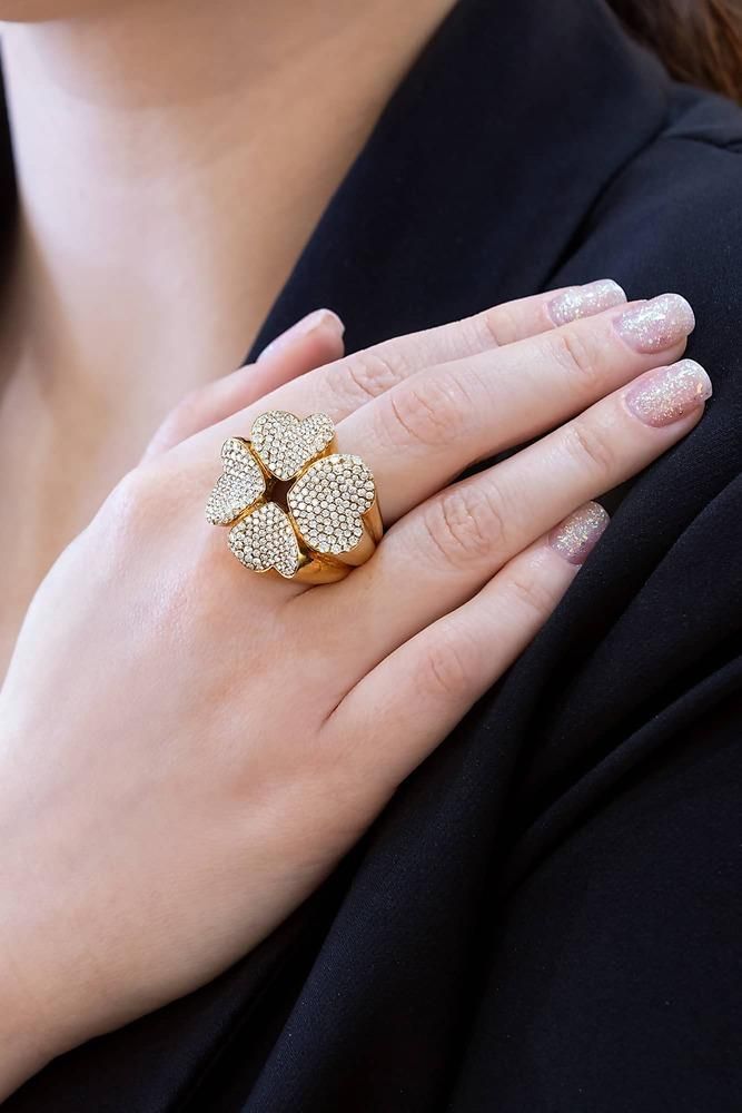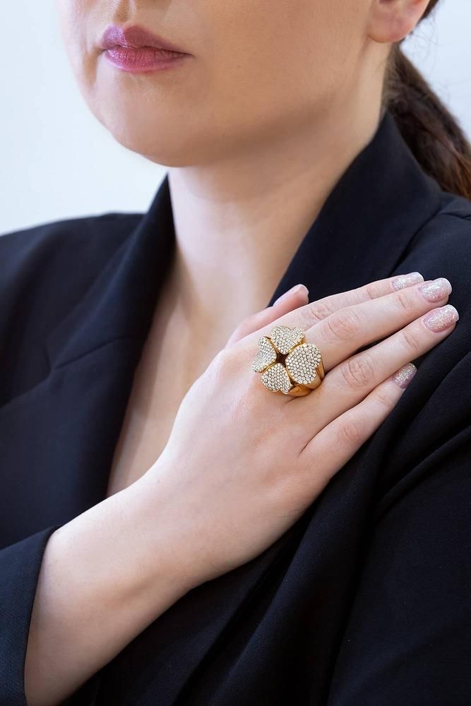 Pasquale Bruni ring from the 4Love collection in 18kt yellow gold shaped like a flower, each petal being a heart decorated with diamonds 3.53 ct. Size 18. The jewel is sold with Luxury Zone box and warranty.