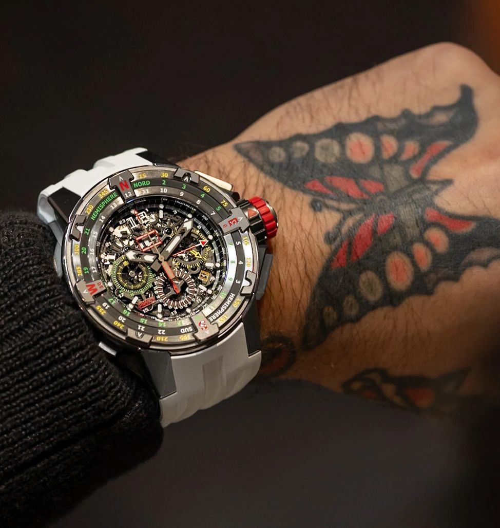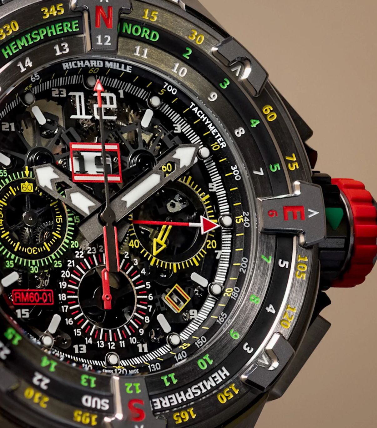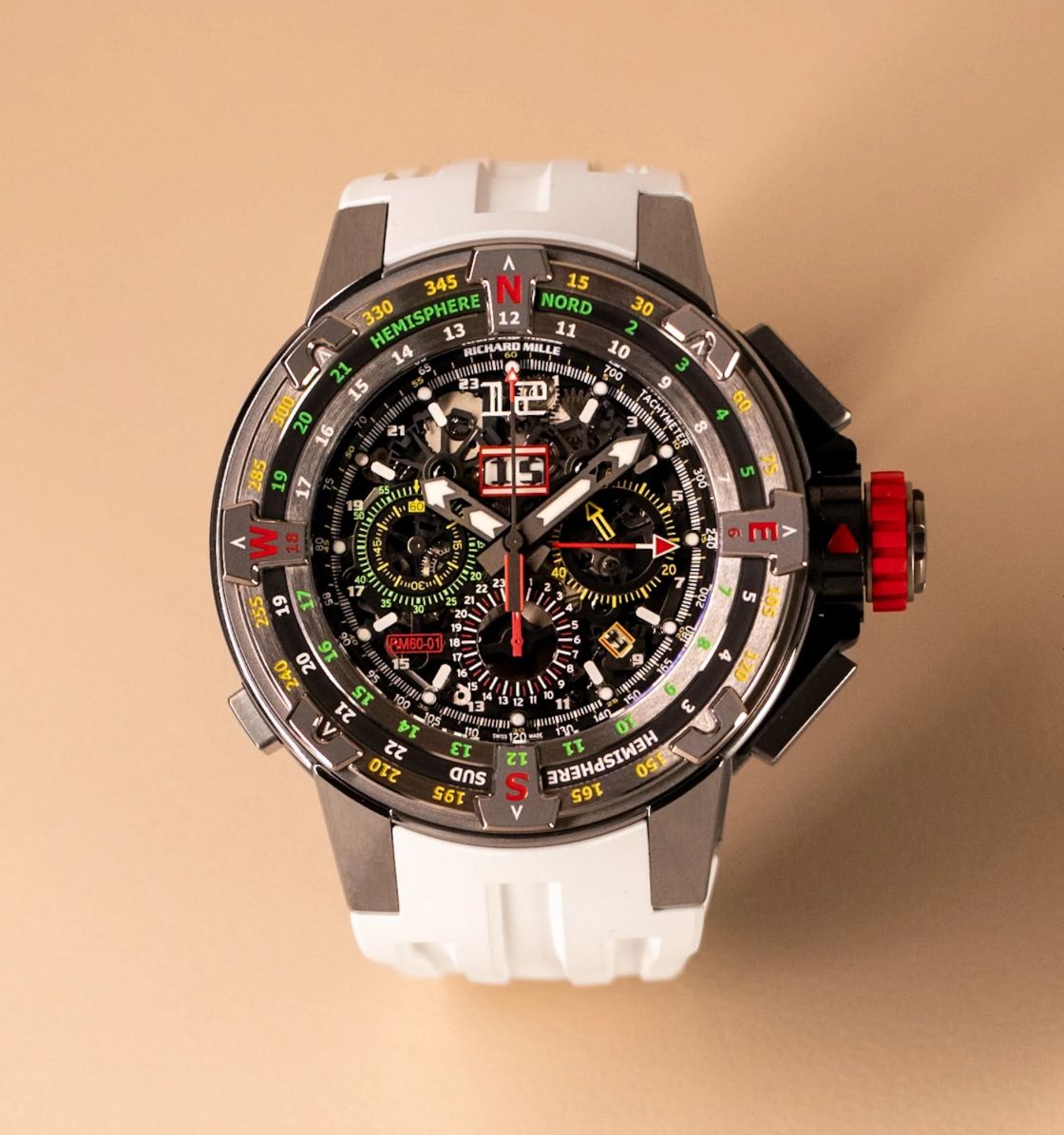 A study in technical brilliance and real luxury, the Richard Mille RM60-01 TI is engineered for life lived offshore. Crafted in lightweight titanium with a bold 50mm presence, this flyback chronograph regatta watch features a skeletonized dial and a three-dimensional rotating bezel that allows sailors to find their heading without a compass.