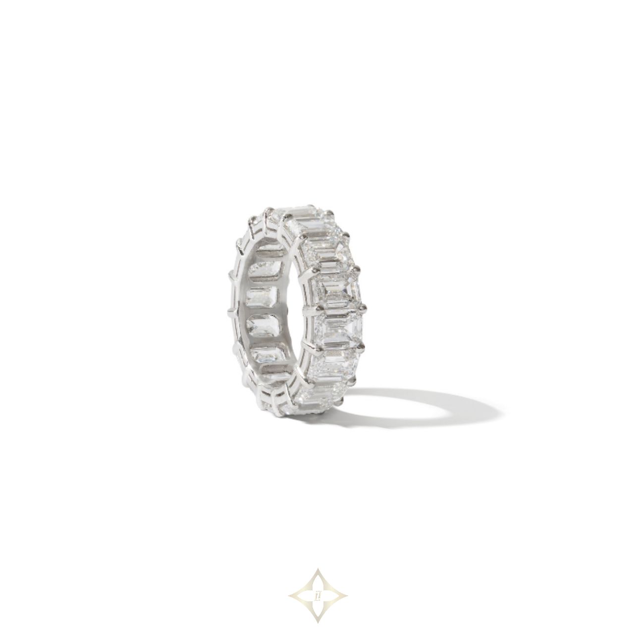 This sublime eternity ring features 11.22 carats of emerald-cut diamonds set in platinum. Brilliant design and craftsmanship.