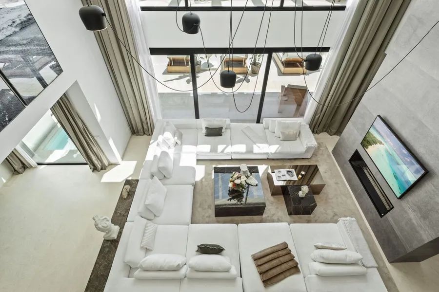 The interior of Villa Marielle is equally impressive, with immaculate design evident throughout the seamless open-plan living area featuring high ceilings. The living, dining and kitchen spaces are interconnected, creating a stylish and comfortable environment. The state-of-the-art kitchen, characterized by elegant white cabinets and a stunning island, is equipped with the latest appliances. Each bedroom is a testament to bespoke luxury, with direct terrace access and unique vibes. The master bedroom steals the show with its incredible design, walk-in closet and impressive en-suite bathroom.
