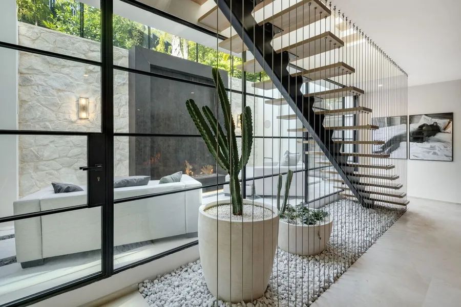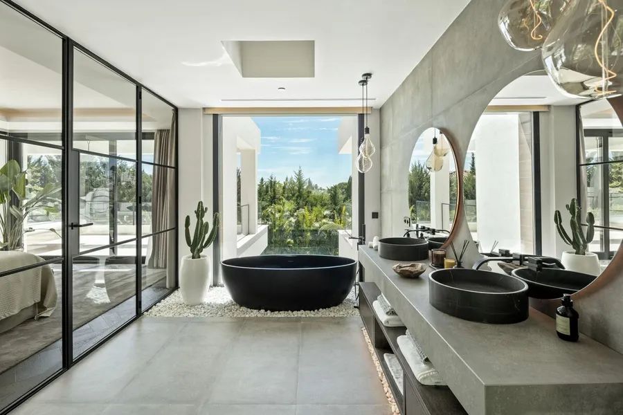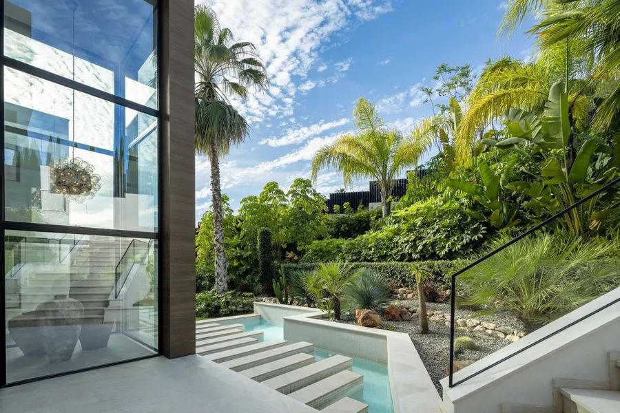 The outdoor spaces of Villa Marielle are nothing short of a wonder for residents. Immaculately manicured gardens surround the property, ensuring privacy and creating verdant corners adorned with palm trees and olive trees. The terraces cater to alfresco dining and chill-out areas, with a unique pergola housing a sunken chill-out area and fire pit—an ideal setting for entertaining. The private pool, spanning almost the entire width of the property, features an integrated jacuzzi and a shallow end that extends into the interior, accompanied by a captivating waterfall feature. An outdoor kitchenette with a barbecue and dining area further enhances the allure, providing the perfect backdrop for summer nights and entertaining.