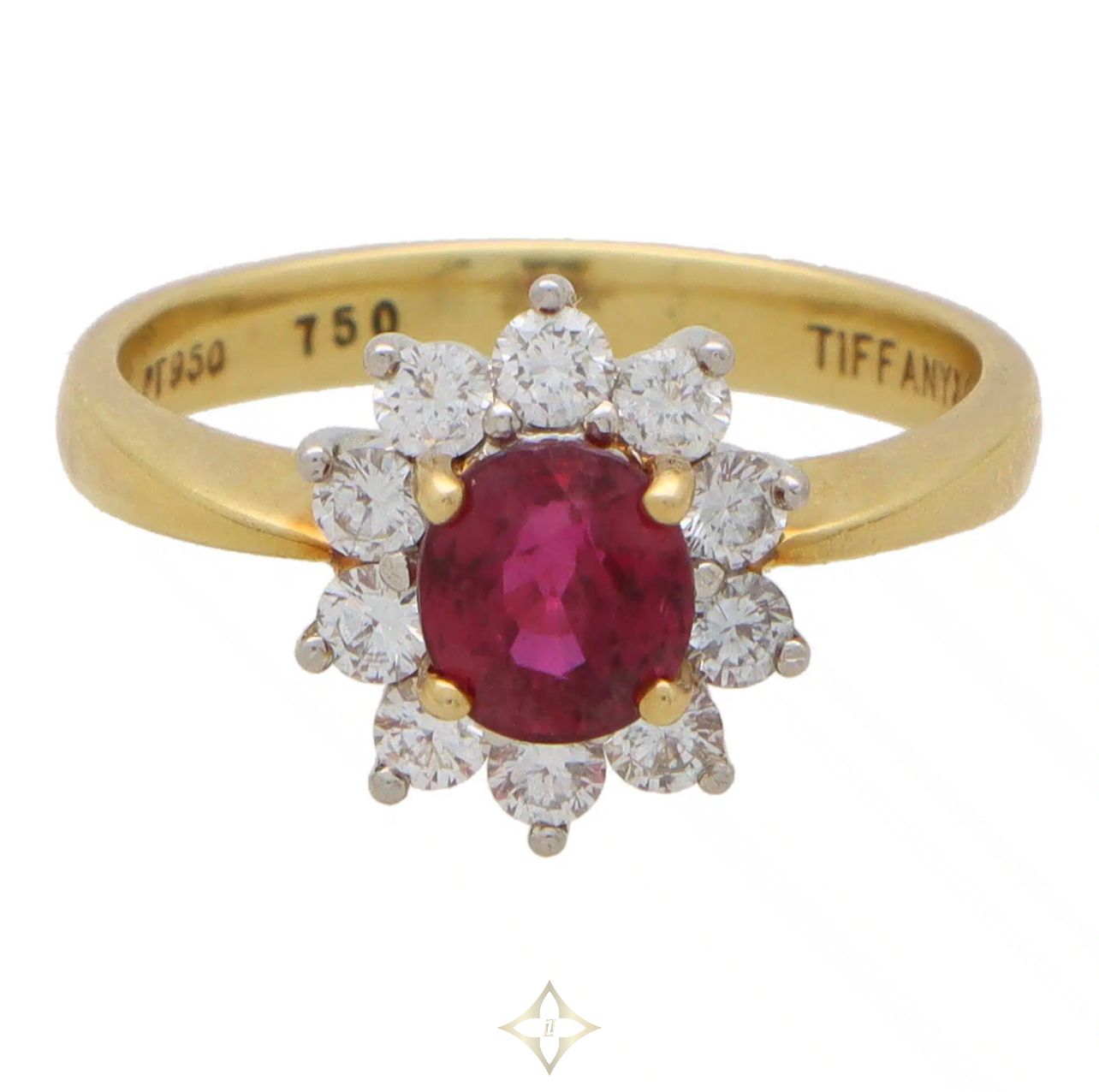 A beautiful vintage Tiffany & Co. ruby and diamond cluster ring set in 18k yellow gold and platinum.