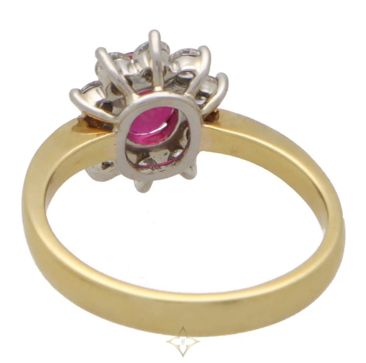 The piece is centrally set with a vibrant oval cut ruby which is four-claw set securely. The ruby has a fantastic colouring to it and is surrounded by a cluster of 10 round brilliant cut diamonds; all of which are claw set in a platinum setting.