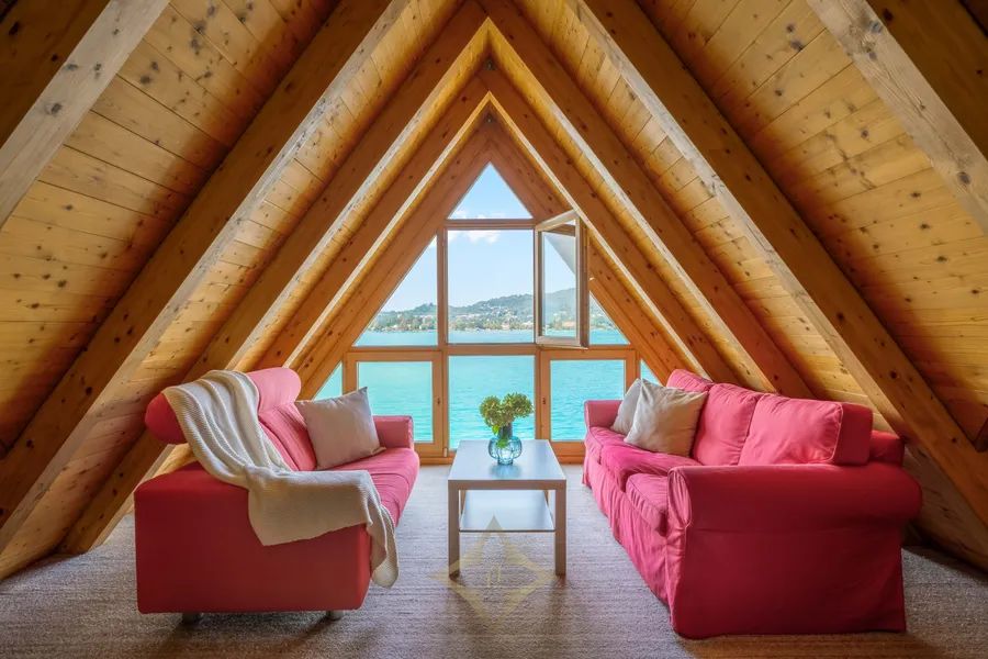 This enchanting lakeside house combines elegance and comfort to create a true feelgood home. The property‘s three floors, where coziness is paramount, are perfectly designed and furnished. Together with the picturesque lakeside plot, the impressive length of shoreline, and the private jetty with boat mooring, they create a truly unique estate. The terrace adjacent to the living/dining area is the ideal place to experience the wonderful garden that invites you to enjoy Lake Wörthersee in all its splendor. The property‘s top floor is a particular highlight. Its large gable window opens out onto the turquoise waters of Lake Wörthersee and offers a breathtaking panoramic view of the surrounding natural landscape.