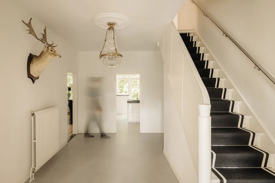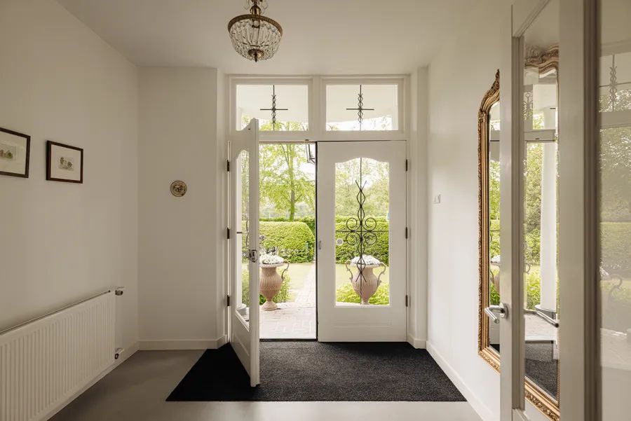 Upon entering, you immediately feel the warm atmosphere of the house—this is truly a home. The stately double doors lead to the vestibule, where the beautiful wooden staircase and elegant chandelier in the hallway catch your eye. Together with the modern Eurocol stucco floor, this creates a perfect blend of classic and modern.