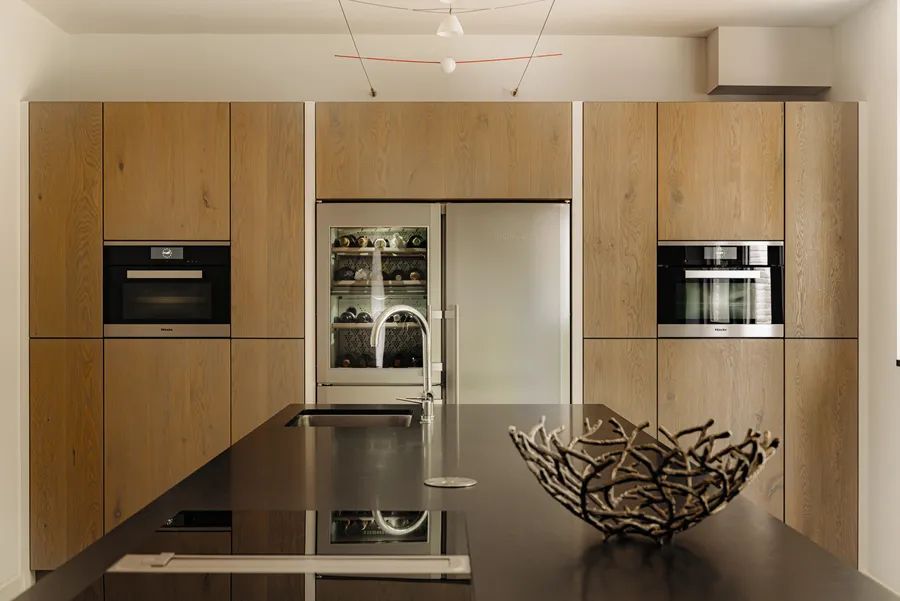 The spacious, modern kitchen features an island and various built-in Miele appliances, a Liebherr fridge/freezer combination with a wine climate cabinet, and a Bora Professional induction hob. French doors offer views of the beautiful garden. Adjacent is the practical utility room, which also provides access to the cellar, perfect for a wine collection.