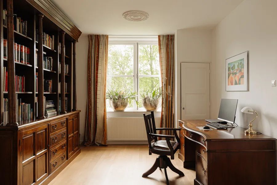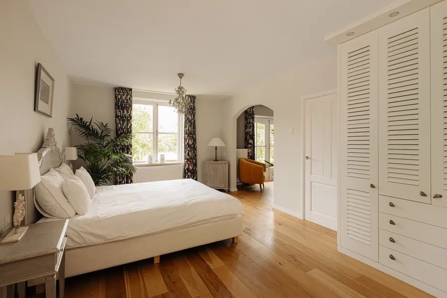 Via the wooden staircase, you reach a spacious landing with parquet flooring. Here you will find five bedrooms, one of which is ideal as an office, two bathrooms, and a separate toilet. Both the toilet and the two bathrooms have underfloor heating. The guest bathroom has a comfortable bathtub, while the spacious master bedroom has an ensuite bathroom with a walk-in shower and overlooks the grazing horses of Duinmanege van Poelenburgh. There is also a balcony where you can greet the morning sun.