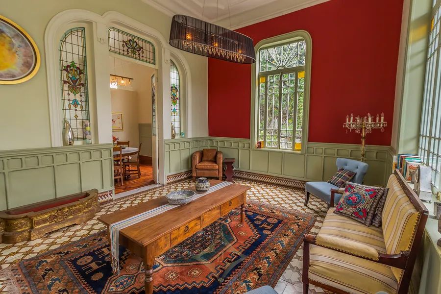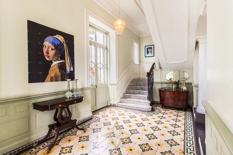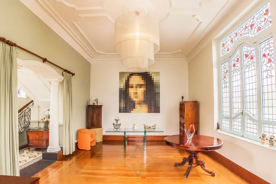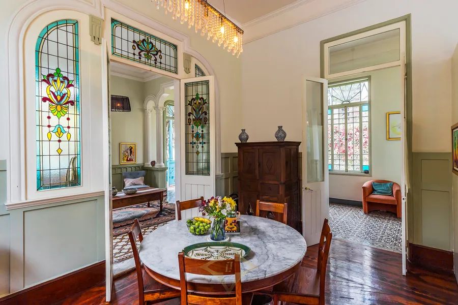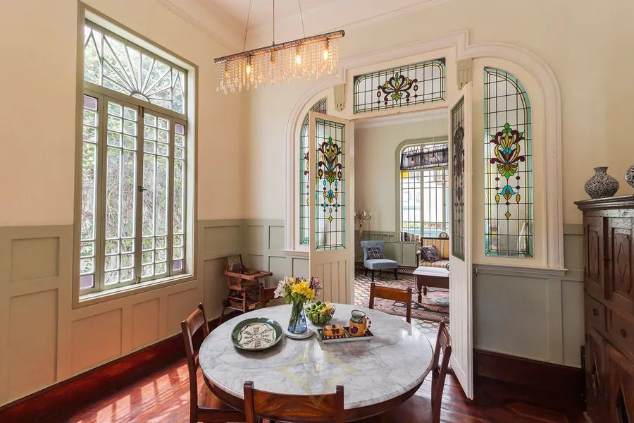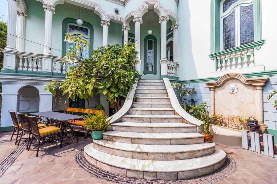 The rooms of the main house are characterized by high ceilings with moldings, original hardwood floors and large windows with original stained glass windows that allow for excellent natural lighting. The elegant and sophisticated ambiance is complemented by marble and plaster details such as moldings, columns, staircases and French balconies.