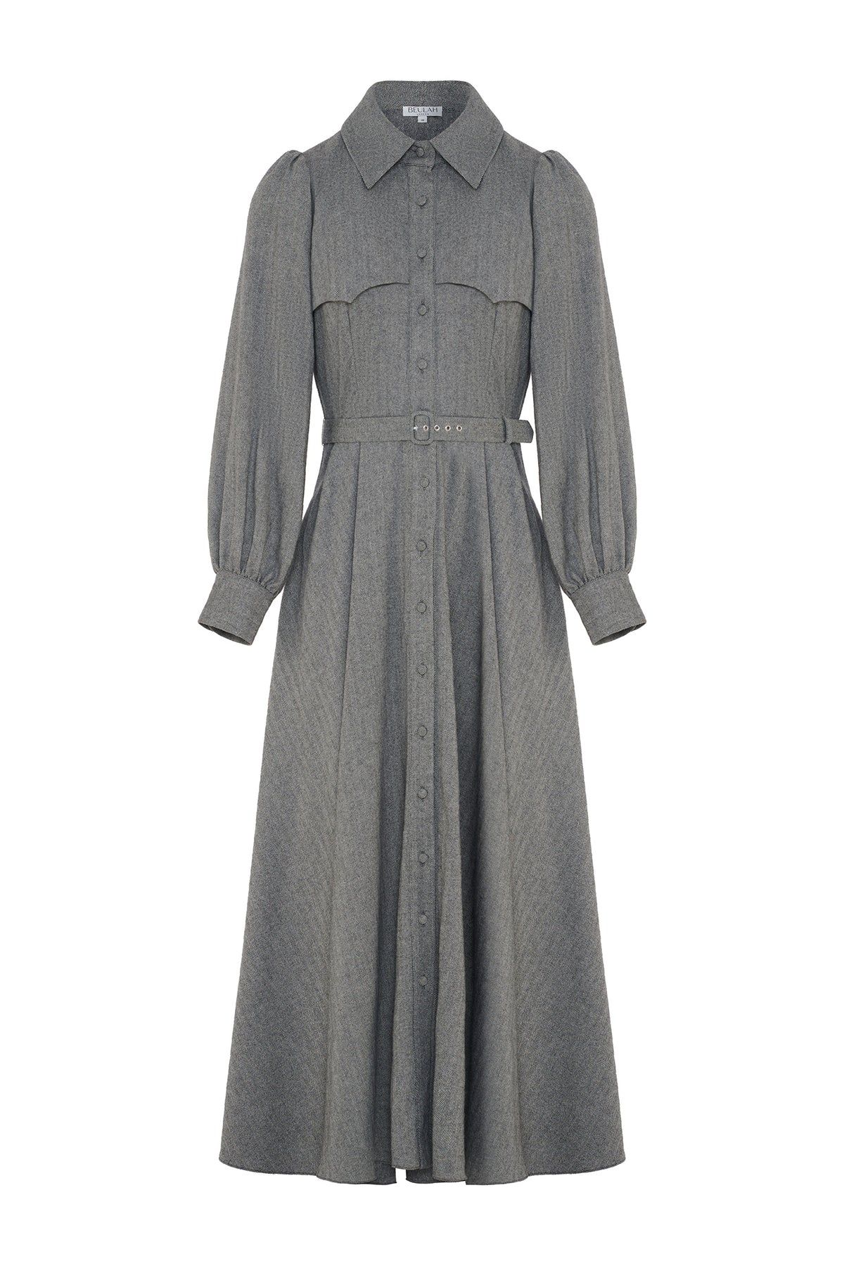 The Isadora Dress has been reimagined for this winter. Crafted in herringbone wool. This elegant design features a fitted bodice and a full, flowing skirt that moves beautifully with every step, offering a versatile style that will accompany you through the colder months. The Isadora is designed with classic trench-inspired detailing on the front and back, along with timeless shirtmaker sleeves and a collar.