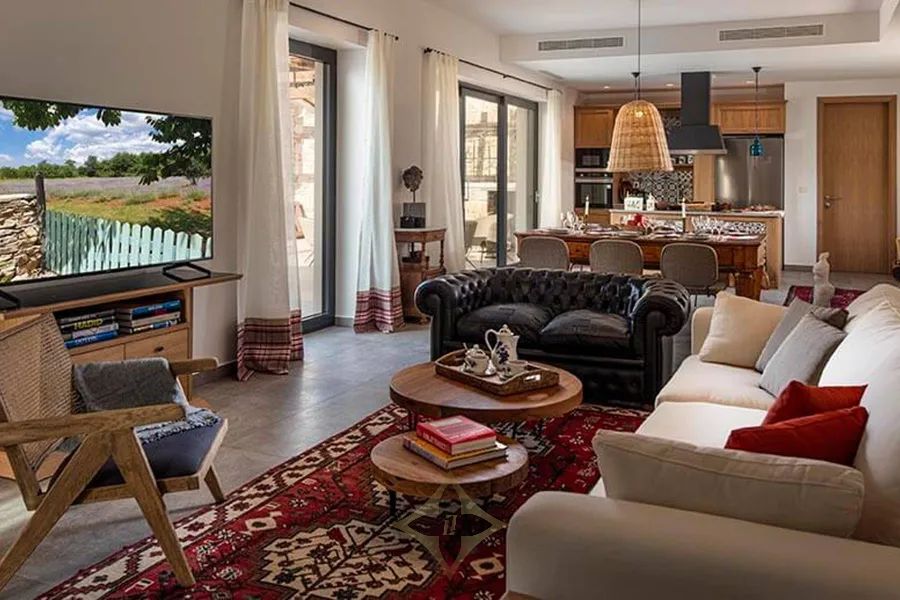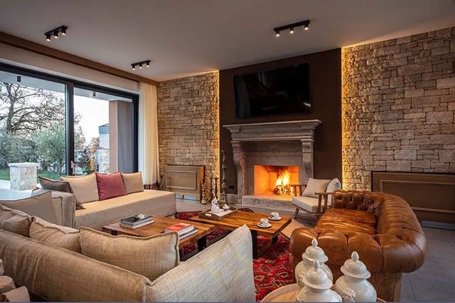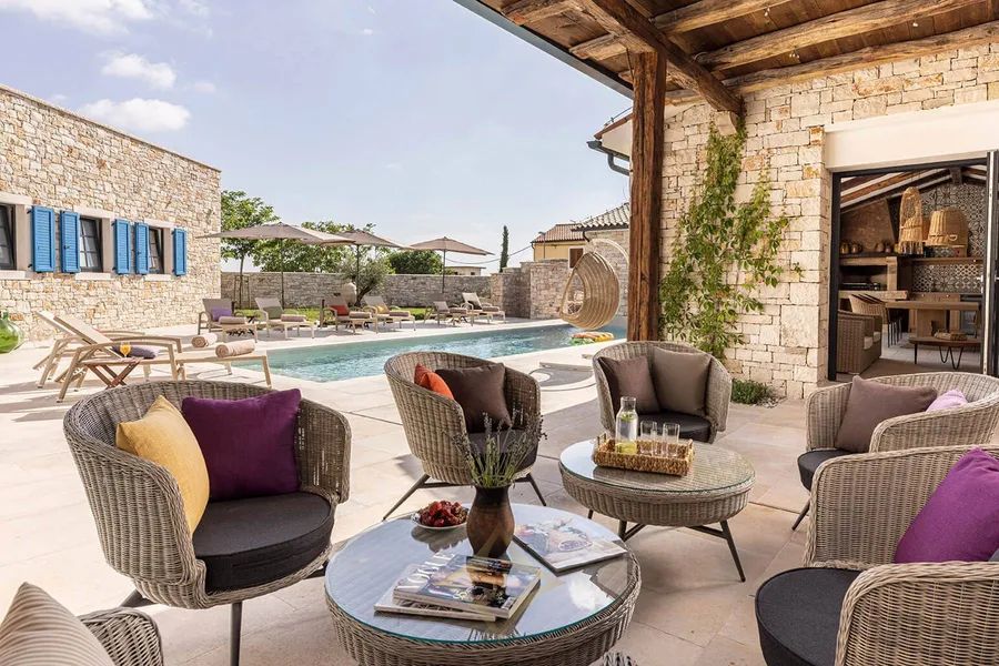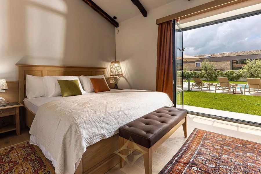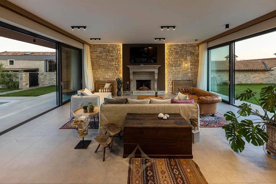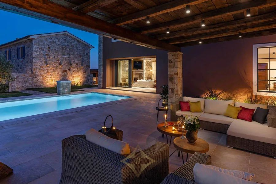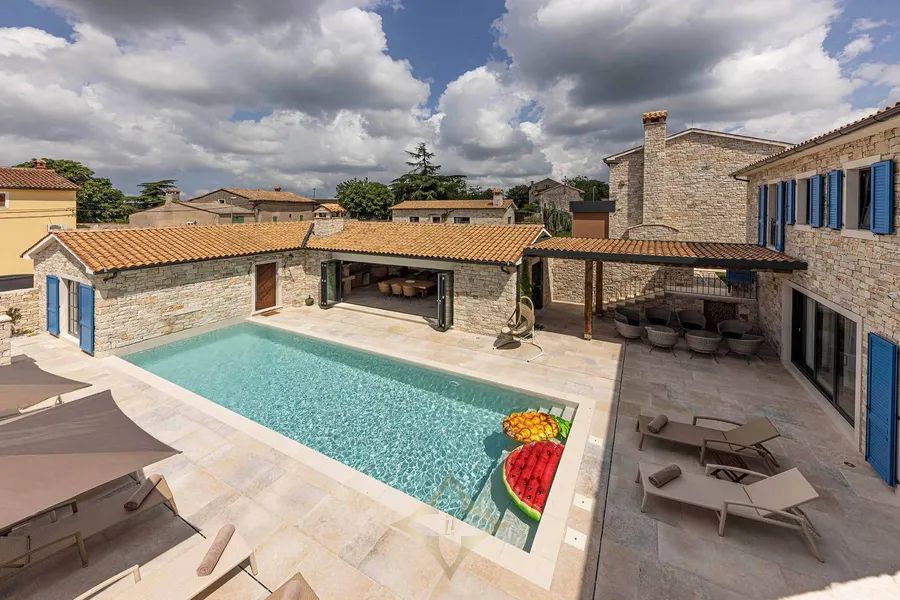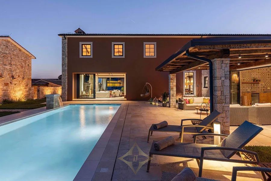 Istria, in the region of Kanfanar municipality, these beautiful stone villas with a total gross floor area of 1561 m2 are located on a plot of 2930 m2.A quiet Istrian place located in the green surroundings of the hills, only a 15-minute drive to the Lim Channel, where you can enjoy sea delicacies, famous oysters, and a view of the Lim Channel.The houses are superbly equipped, construction of the highest quality, aluminum carpentry in all rooms, 2000 m2 of stone drywall completely round off this fairytale environment.Villa H1 - is an impressive 876 m2, located on an immaculate green area of 1780 m2, with a beautiful, almost Olympic-sized pool of 75 m2. It consists of 7 spacious bedrooms, 7 bathrooms, 3 toilets, a living room of 86 m2, a balcony of 27 m2, a wine cellar, a beautiful kitchen for the needs of all tenants, 6 parking spaces.Next to the villas is the common Fun building H3 of 170 m2, which is equipped with all the attractive and desirable equipment for leisure and entertainment, as well as an auxiliary building of 70 m2.Villa H2 is 445 m2, on a plot of 1150 m2, with 4 large bedrooms with bathrooms, 1 toilet, swimming pool of 52 m2, large modern kitchen and living room of 62 m2.Equipped with 2 saunas, 2 large spacious swimming pools, a gym, billiards, 5 fireplaces, even a bread oven, charging stations for e-vehicles, underfloor heating in all rooms, all this is an integral part of this impeccable landscape.The pictures convey only partially the beauty and quality of these villas
