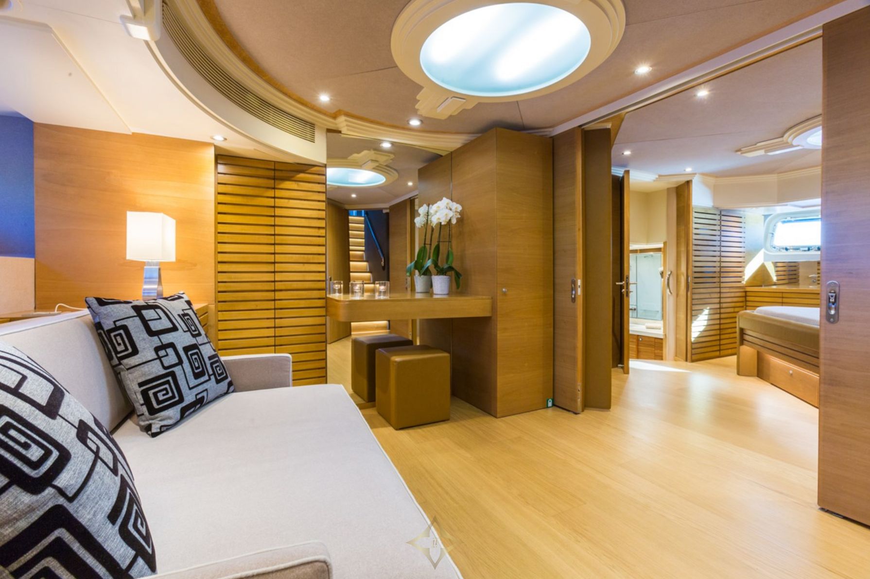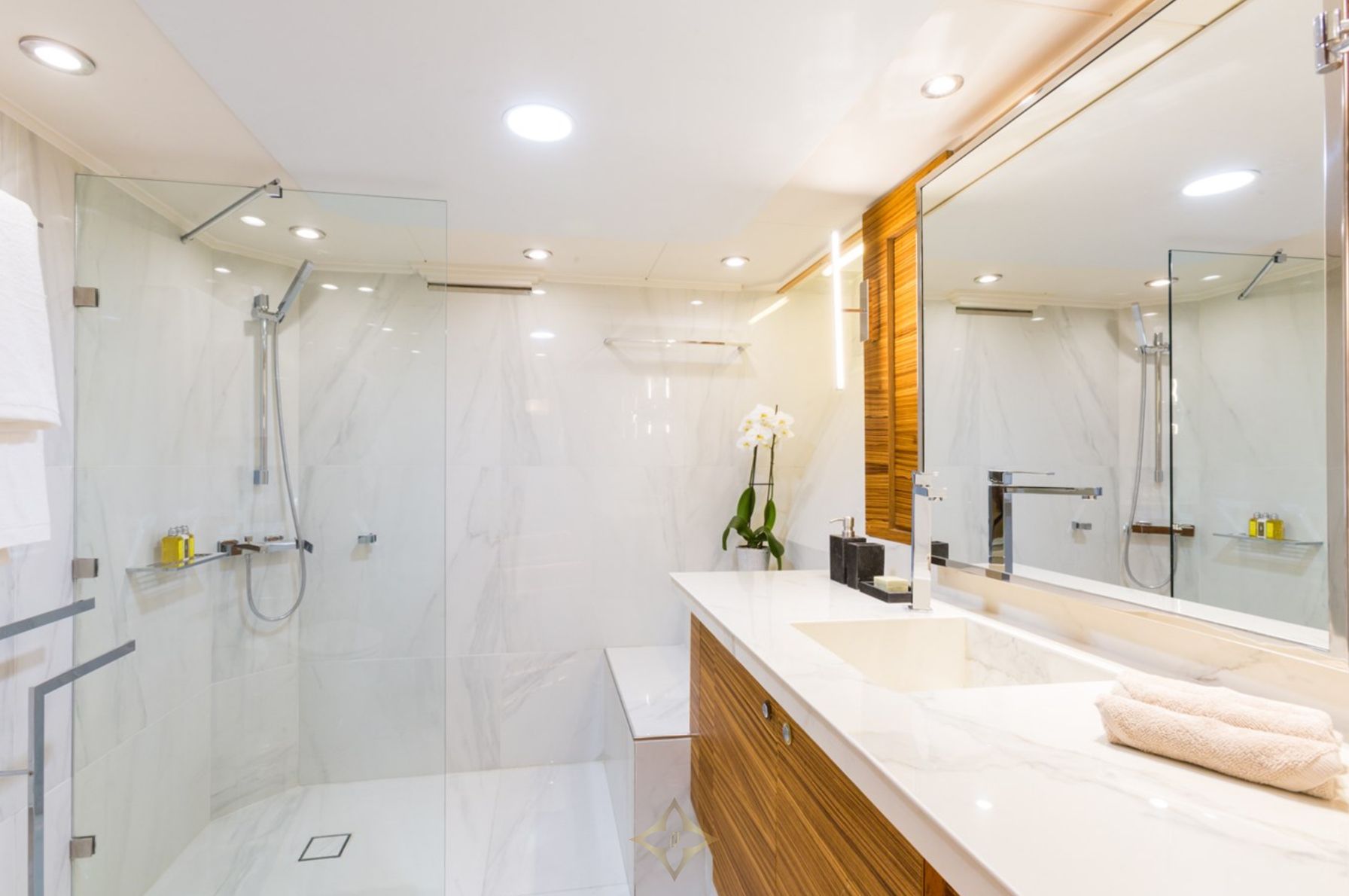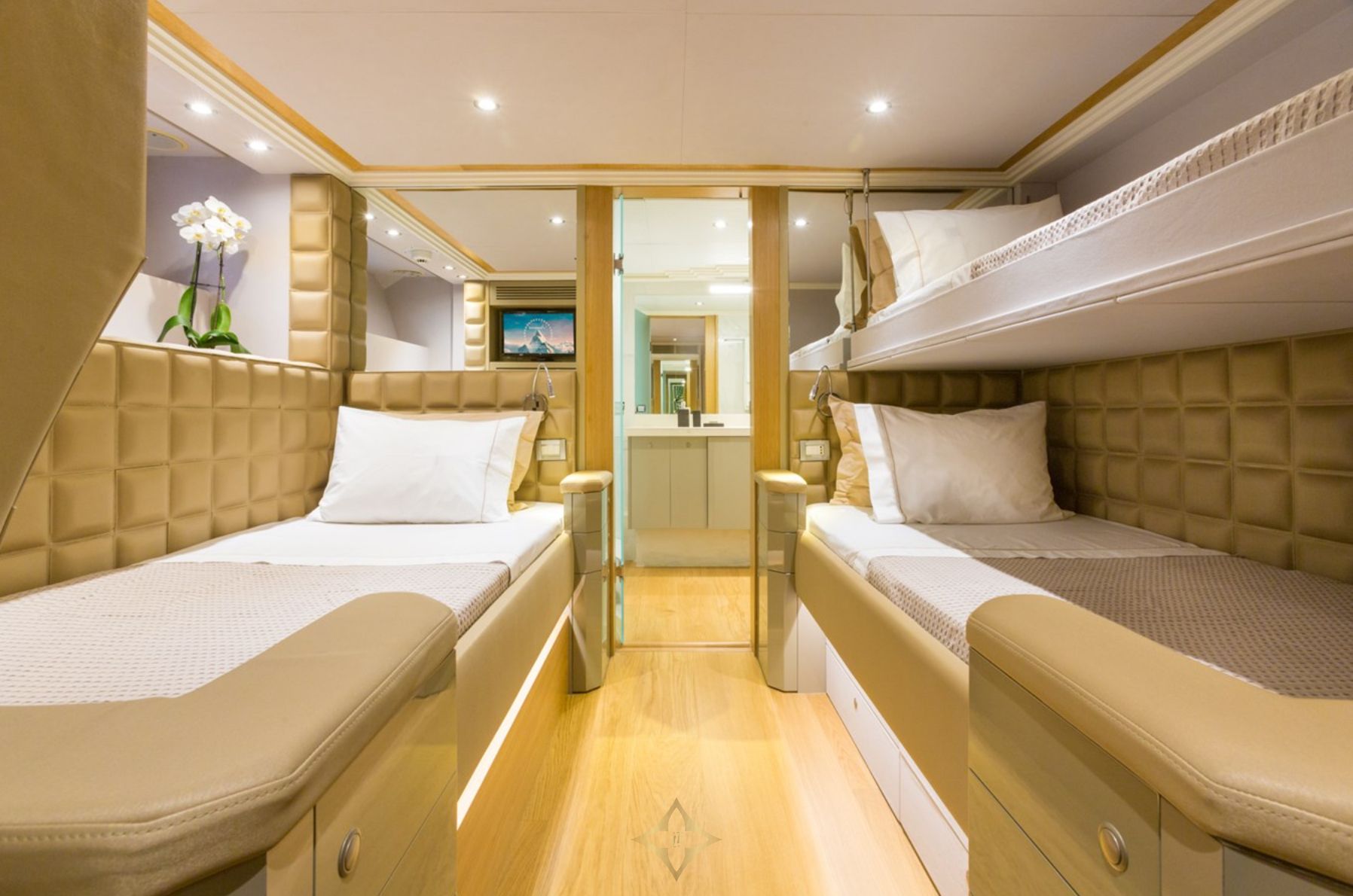 The expansive open-plan main saloon invites relaxation with plush settees on both port and starboard sides, complemented by expansive windows that flood the space with natural light. With a flexible layout adaptable into six cabins, she comfortably accommodates up to 13 guests. The standard configuration includes a luxurious master suite, VIP suite, a double cabin, a twin cabin, and an additional twin with bunk beds. Each guest cabin boasts entertainment centers, television screens, and en suite bathroom facilities, while six crew members are comfortably housed in dedicated quarters.