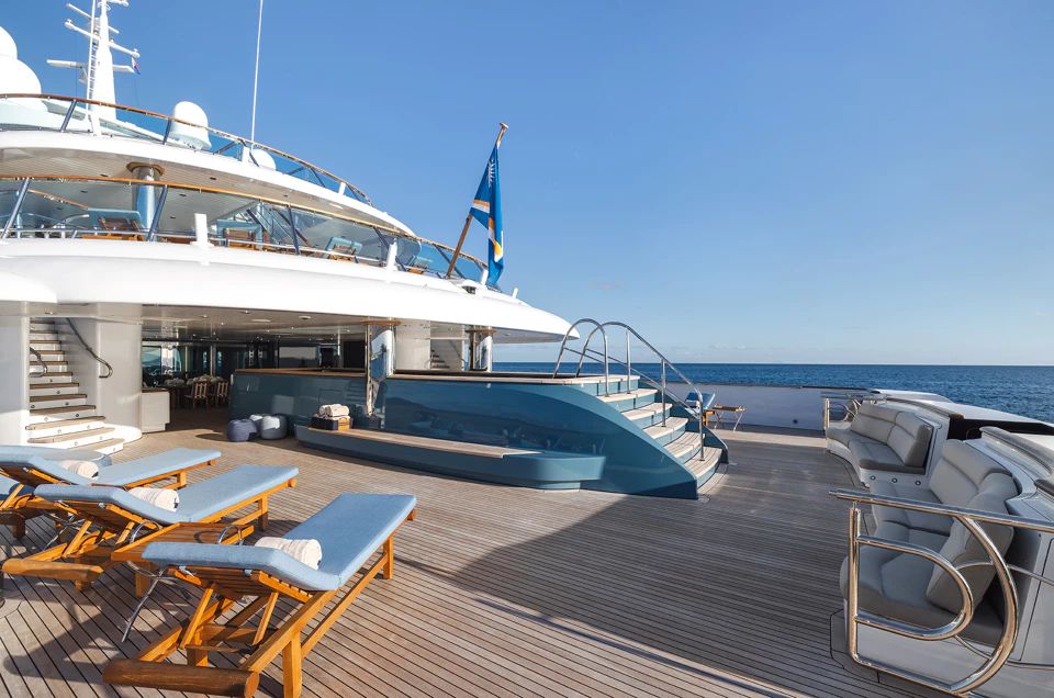 The main deck boasts a centerpiece that captivates the senses - an impressive 12m/39' swimming pool, perfect for savoring moments of relaxation and enjoyment as you take in the breathtaking surroundings. You can also enjoy live sporting events from the two large flat-screen displays on deck.