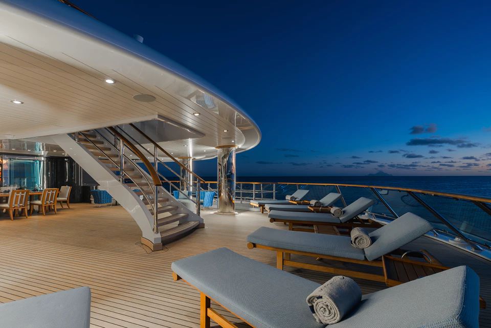The deck also features an inviting club lounge. This secluded setting offers an intimate space for small gatherings, where guests can unwind and create cherished memories. And for those looking for an outdoor experience, step out onto the spacious aft deck to admire the sea and enjoy the breeze.