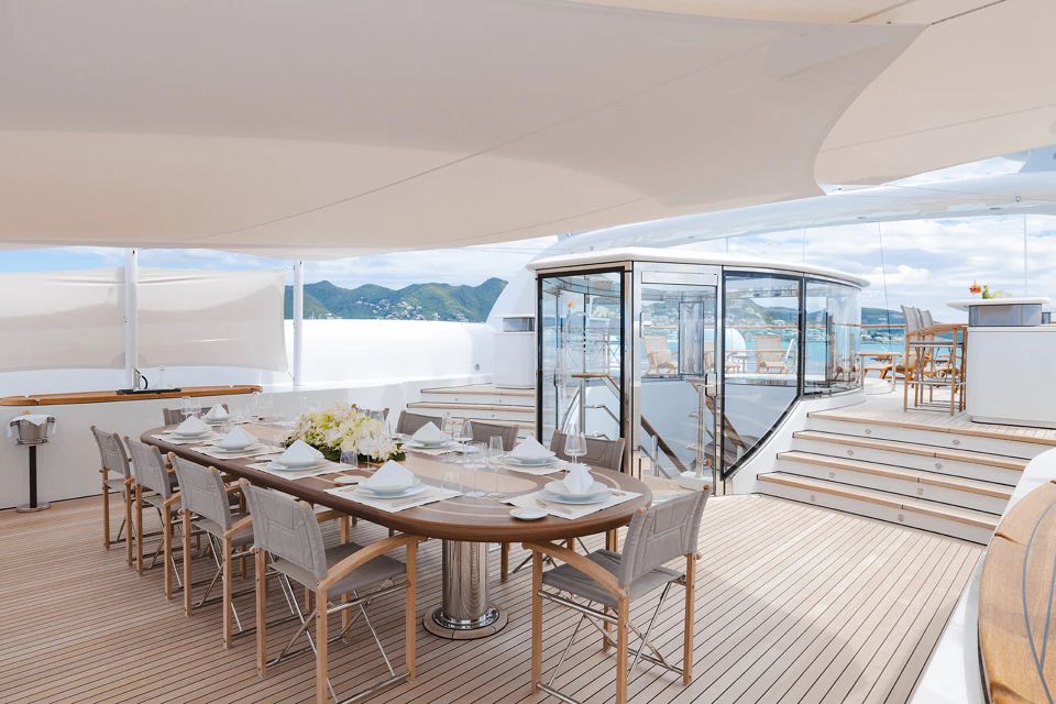 The sun deck, which measures an impressive 124 square meters (1334 square feet), has been thoughtfully designed as an outdoor haven of comfort and relaxation. Lounge in the new outdoor living area, where you can gather with your loved ones. A generous dining table accommodates up to 14 people, and two well-appointed bars offer teppanyaki and refreshing drinks.