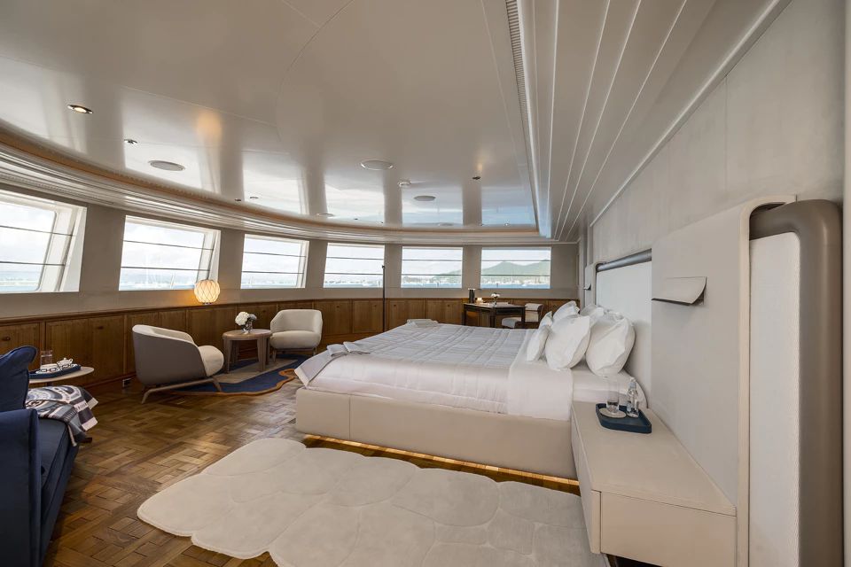 Escape to the upper deck, where you will find privacy. The Owner's stateroom, located forward, offers a 180-degree view of the surroundings, while the living room connected to the stateroom, offers a space of tranquility, surrounded by some timeless art pieces.