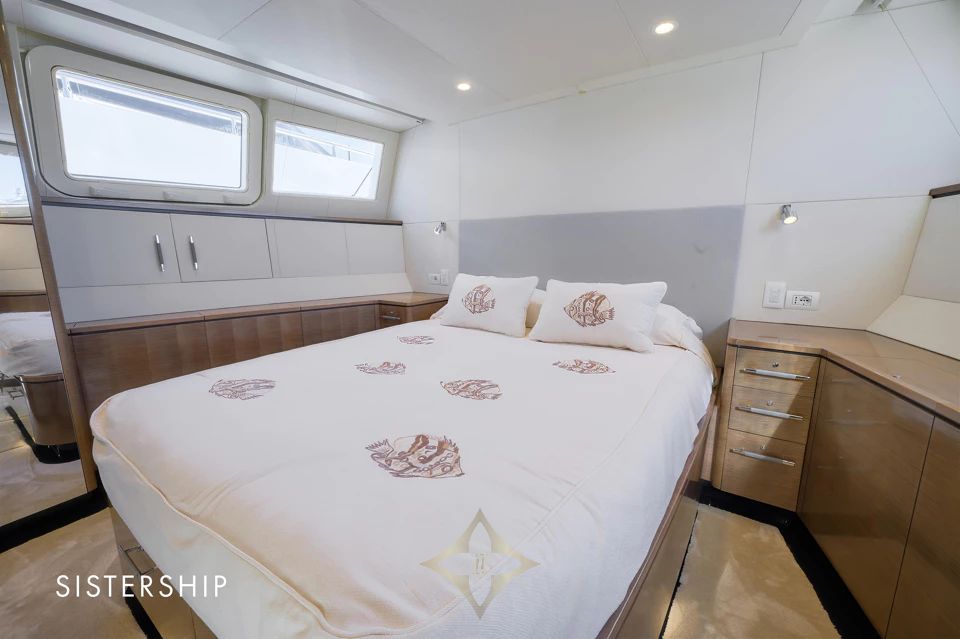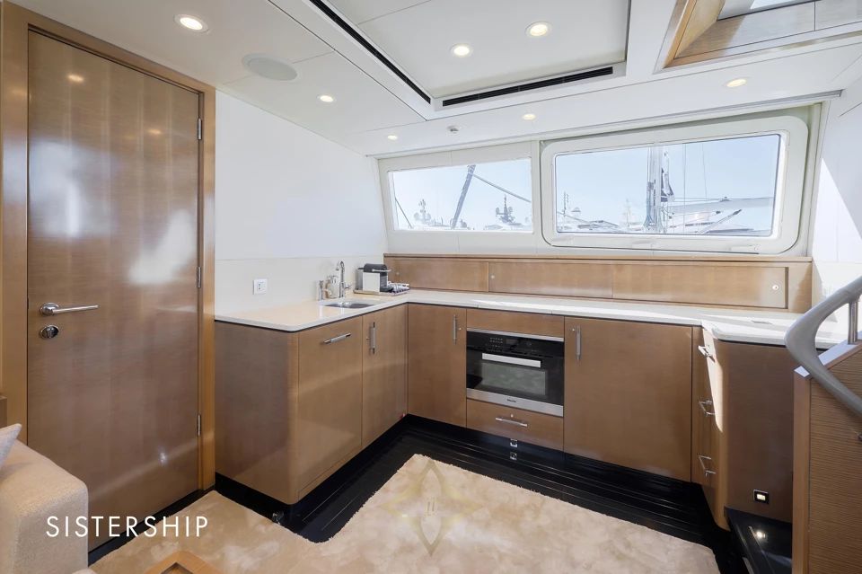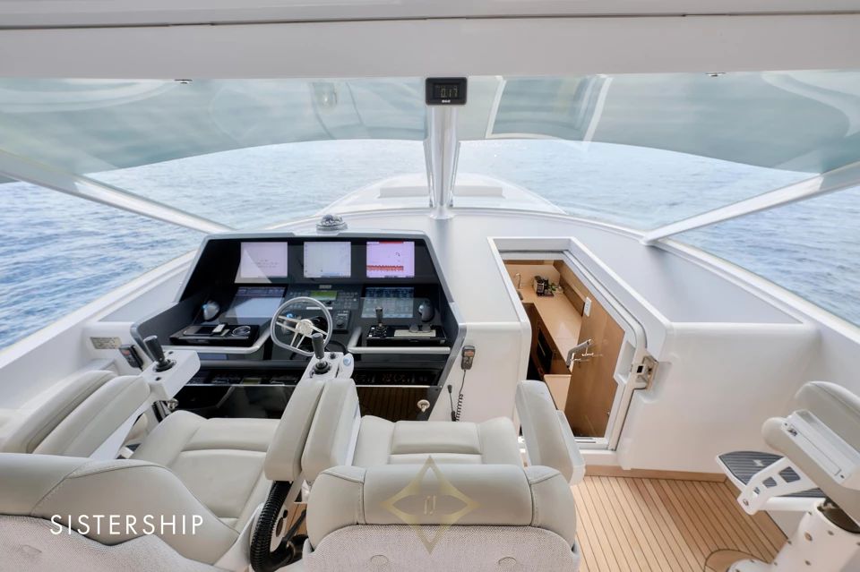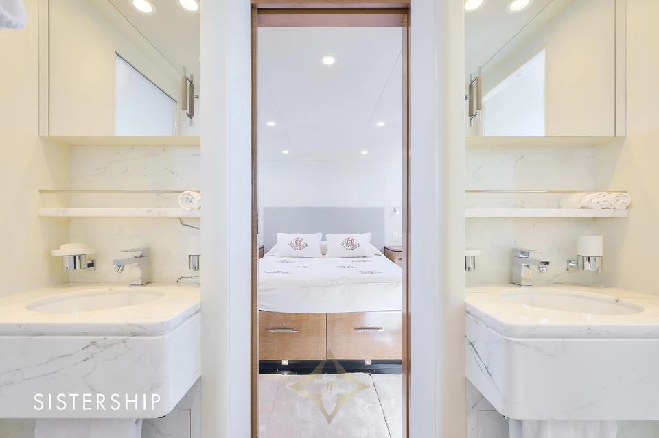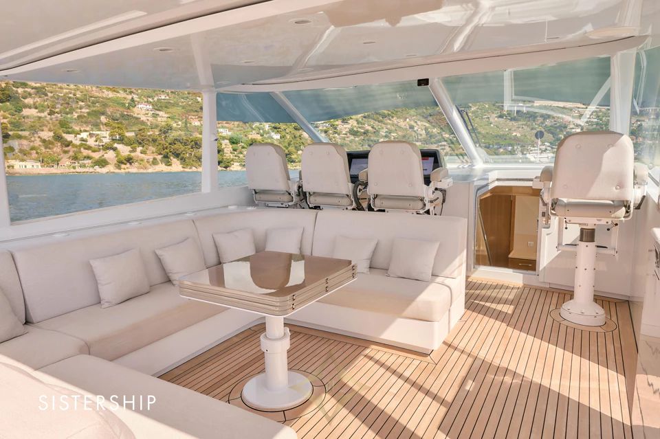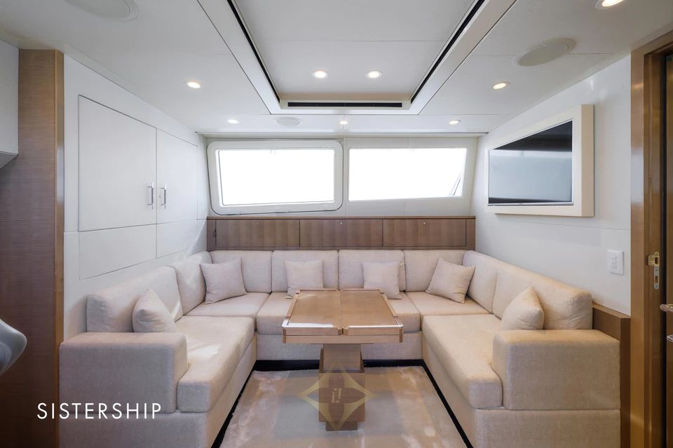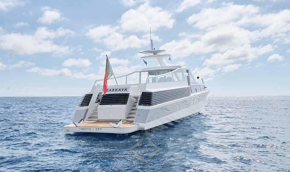 She accommodates 4 guests in 2 contemporary staterooms, including a full-beam Owner’s Stateroom, with separate quarters for 2 crew members. With a cruising speed of 37 knots and a range of approximately 400 nautical miles, VALYRA is built for Owners who value speed, style, and versatility.