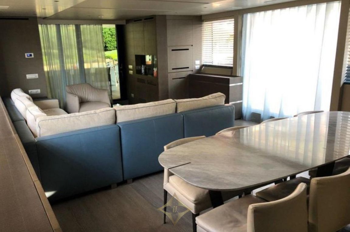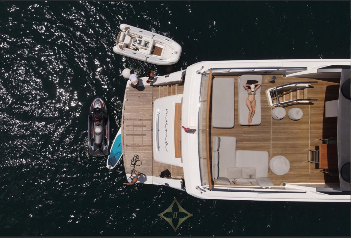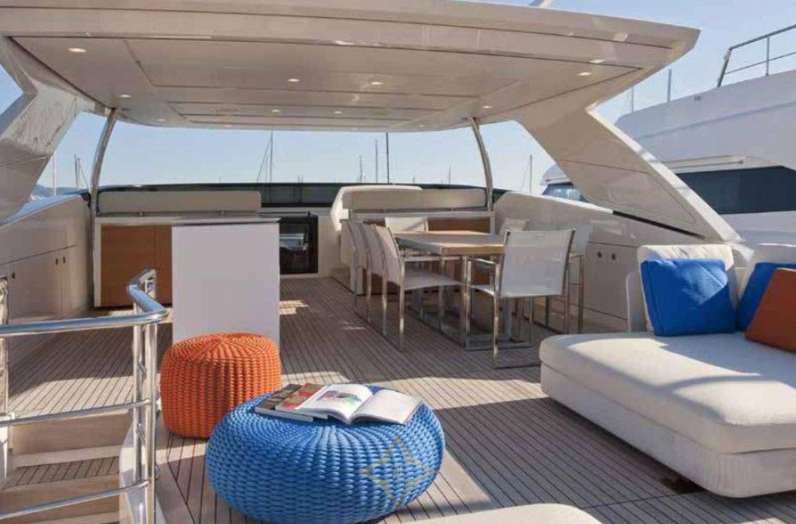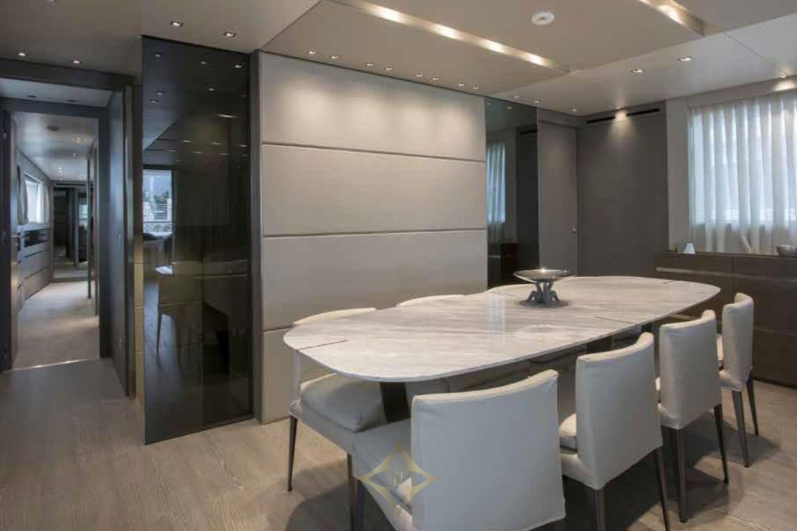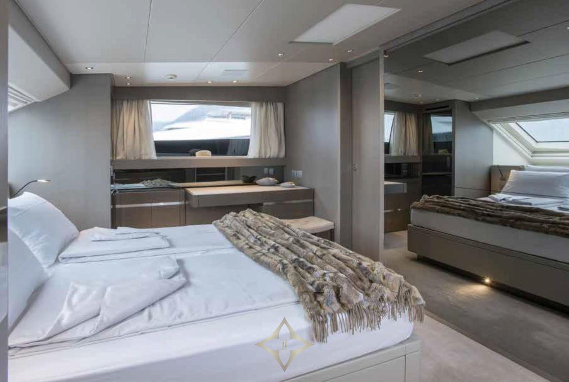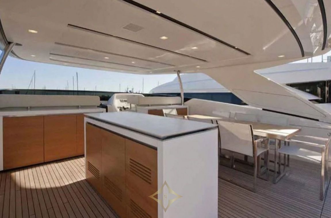 Powered by twin 2216 Hp MTU Diesel engines, she can reach a top speed of 29 knots and cruise at 24 knots. She can comfortably accommodate up to 9 guests in 4 en-suite cabins, including the Owner’s stateroom forward on the main deck, while a large VIP cabin and 2 twin cabins (one with additional Pullman bed), are situated on the lower deck. In addition, 4 crew members will be waiting on their every need.