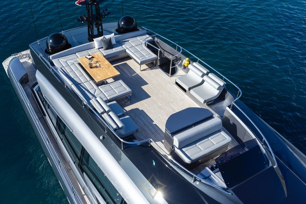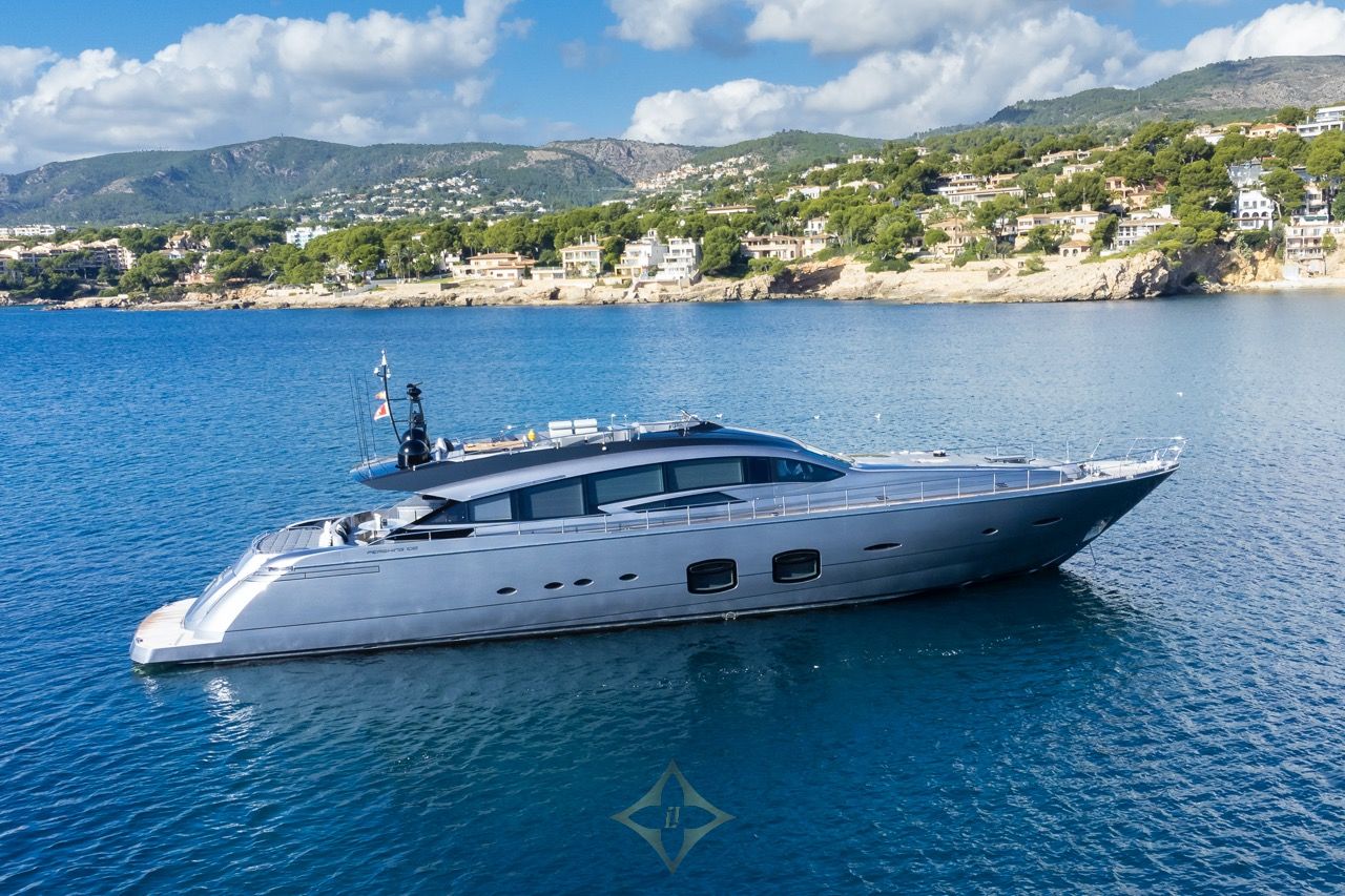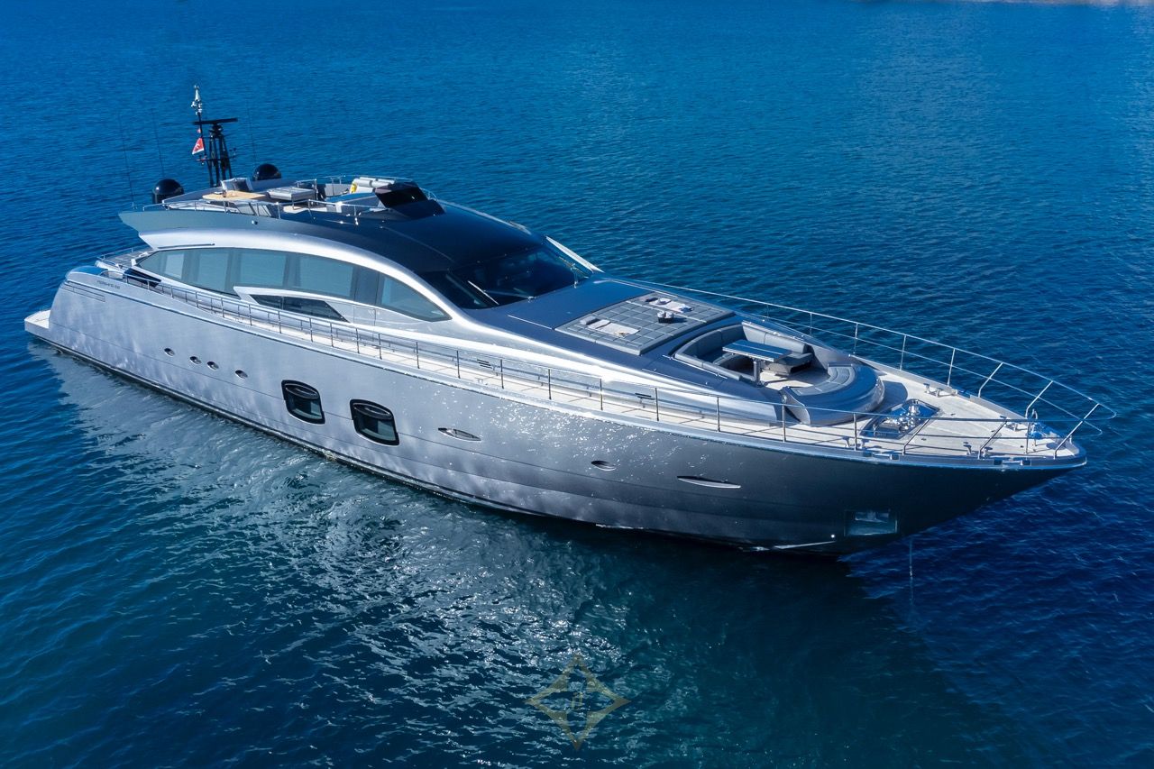 Designed by Fulvio De Simoni (exterior and interior), her sleek lines accentuate a sporty open‑yacht hull with a planing deep‑V form and teak decking. A lightweight GRP hull and superstructure help maximise performance. She features expansive sunpad areas on bow and flybridge, cockpit lounge with wet bar, plus a concealed hatch and garage housing a Williams tender and two Seadoos. Metallic “Anniversary Silver” paint adds refined aesthetics. Shallow draught (~1.8 m) offers access to secluded bays often favoured on Mediterranean cruising grounds.