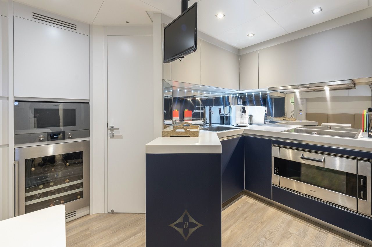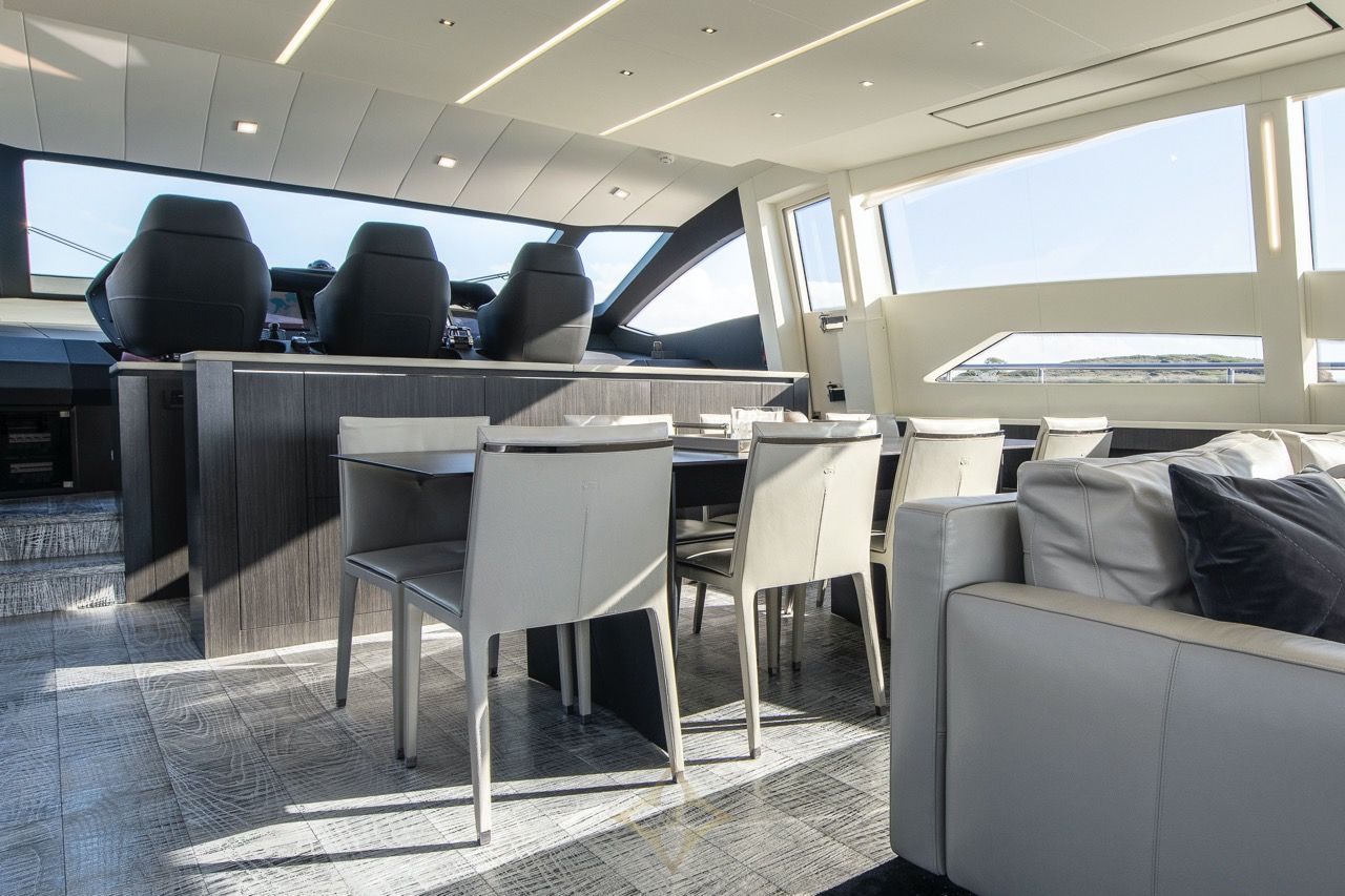 She accommodates up to eight guests in four cabins—a full-beam master, VIP suite, double and a twin—each with en‑suite bathrooms and entertainment centres. The port‑side fourth cabin is currently fitted as a gym, with original furniture retained if reconversion is desired. The main saloon is open plan, featuring an L-shaped leather seating, dining table for eight, drop‑down TV, surround sound and monochrome contemporary styling. High-end materials such as Fendi-leather wall upholstery in cabins and integrated lighting enhance luxury throughout.