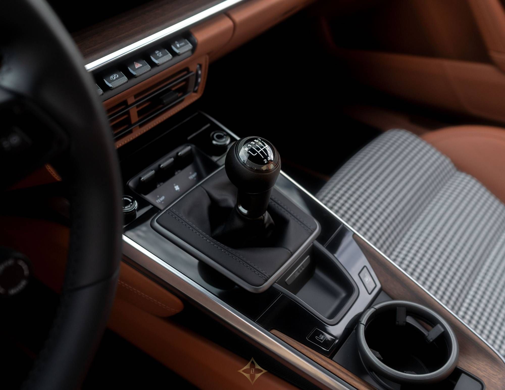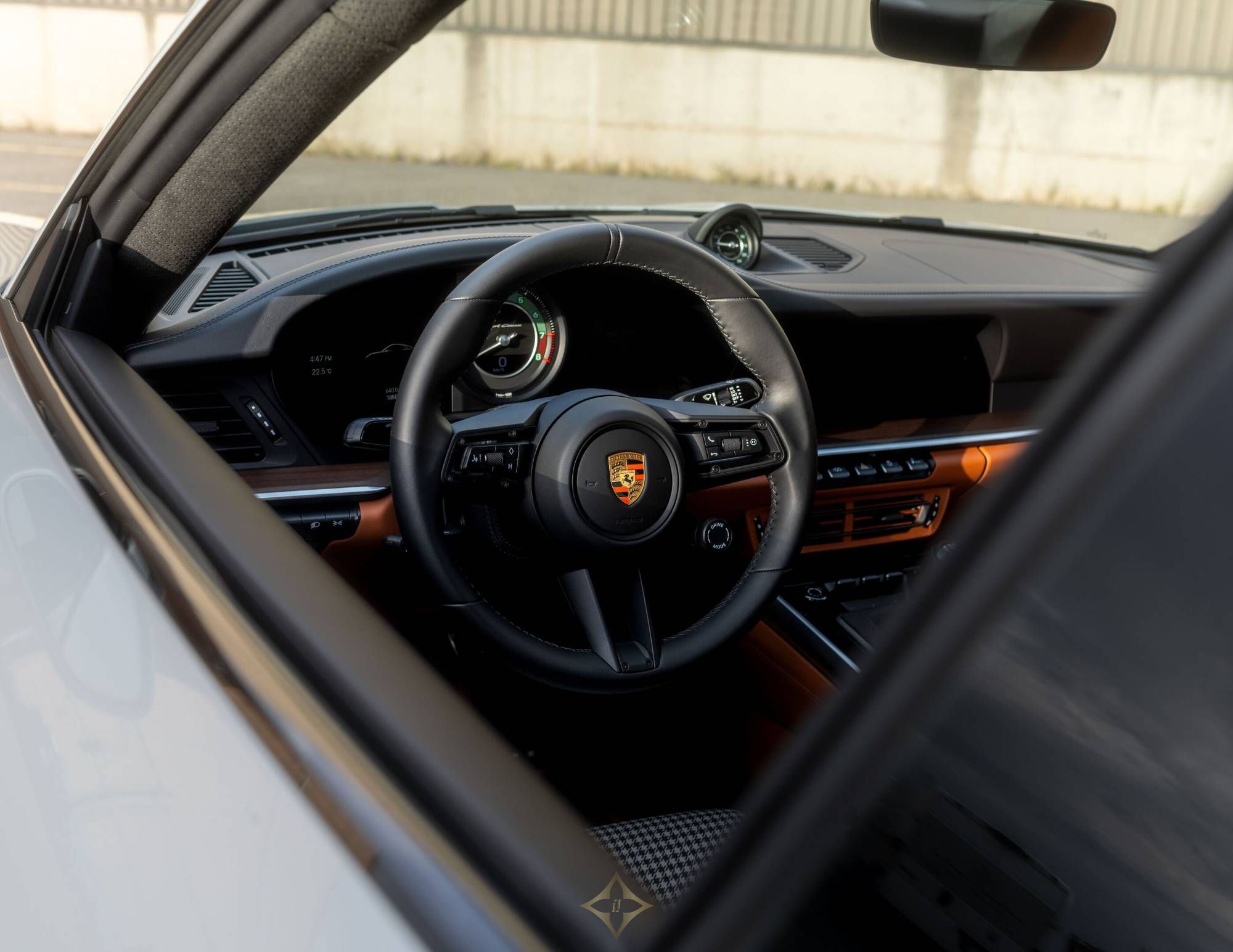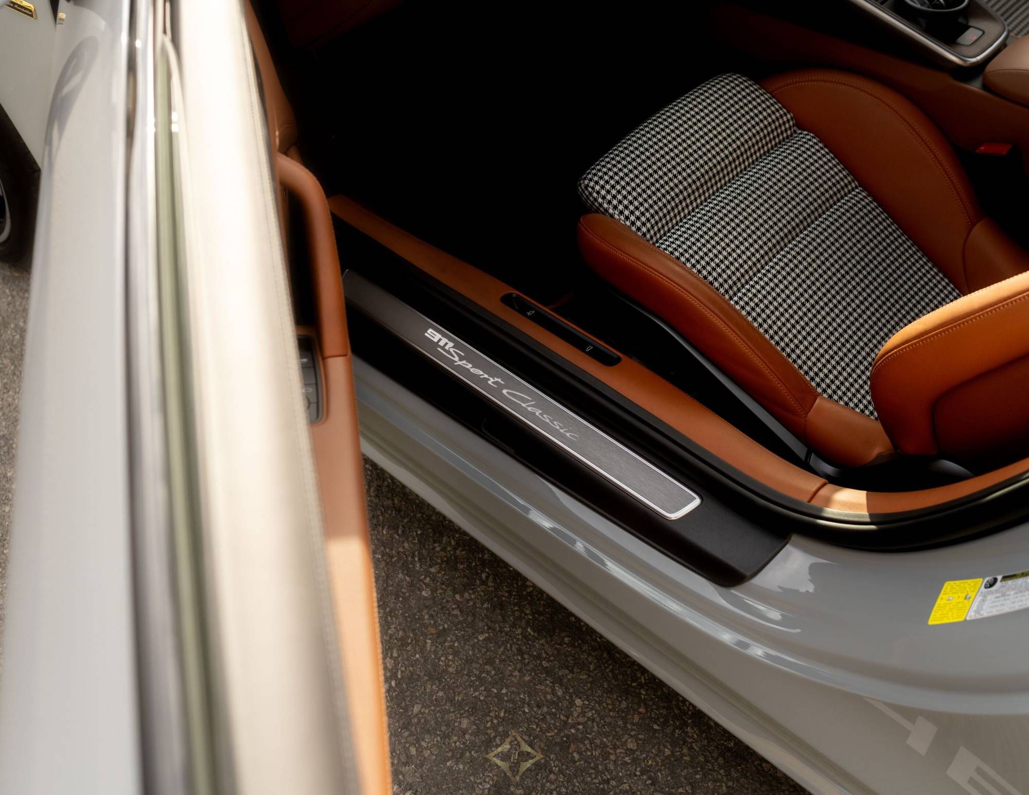 The 911 Sport Classic is powered by a twin-turbocharged 3.7-liter flat-six engine producing around 543 horsepower, paired with a seven-speed manual transmission making and rear-wheel drive, making this a rare combination in the modern 911 range. The interior continues the retro theme, with Pepita houndstooth seat inserts, leather upholstery, and classic design touches like gold-colored badges and classic colored analog-style gauges.