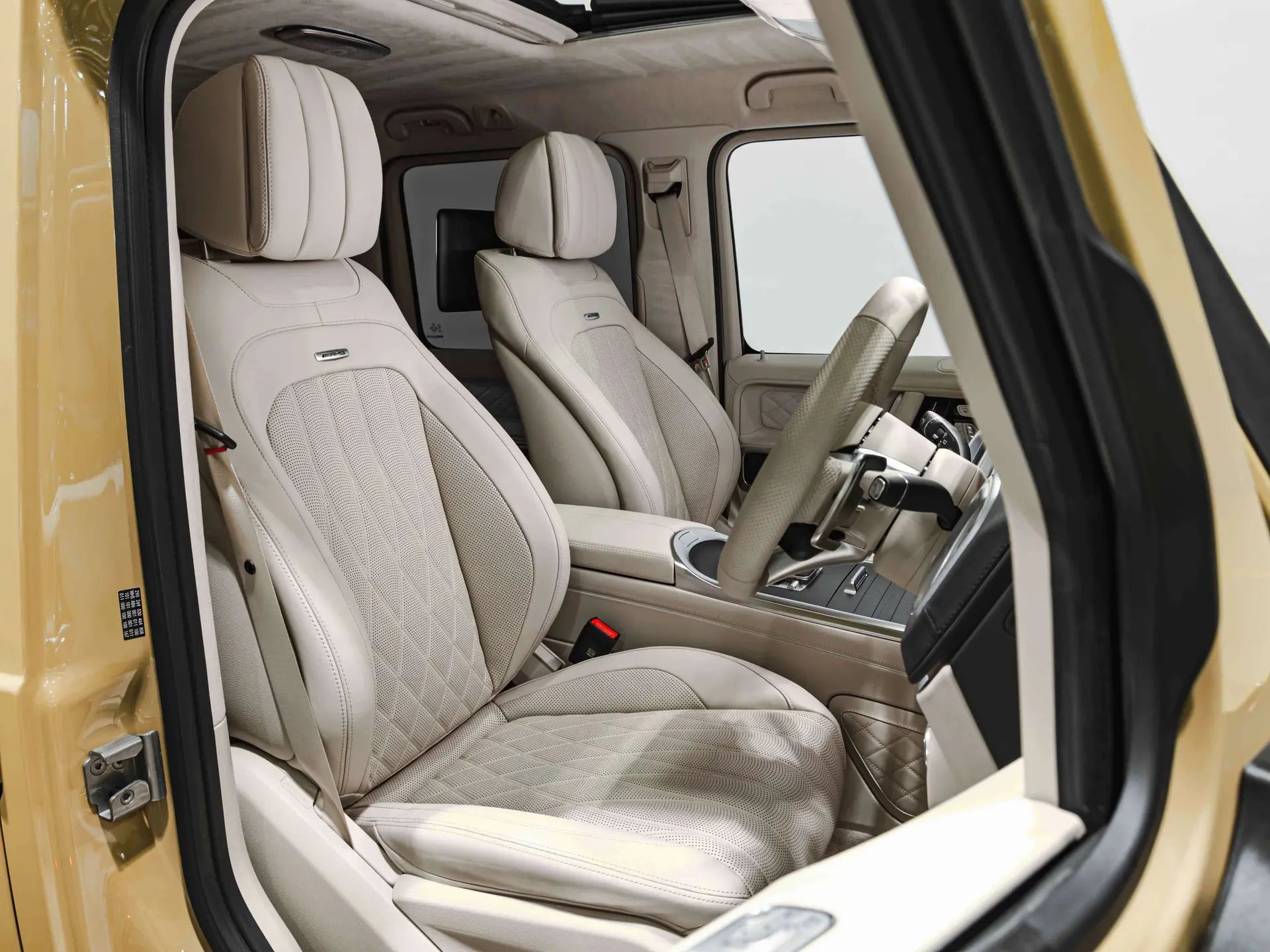 Over a standard G63, the Manufaktur Edition introduces exclusive MANUFAKTUR paint finishes, a MANUFAKTUR spare wheel ring painted in the exterior colour and the MANUFAKTUR Logo Package including MANUFAKTUR doorknobs with embossed logo and MANUFAKTUR logo projectors in the exterior mirrors for the exterior. Interior enhancements are more extensive, including the Superior Line Interior - consisting of the Active Multicontour Seat Package Plus and the Energizing Package Plus, a Nappa leather instrument panel, MANUFAKTUR contrasting topstitching, MANUFAKTUR leather grab handles, black flamed open-pore ash wood MANUFAKTUR trim elements, MANUFAKTUR lettering on the passenger grab handle and diamond quilted seats, creating a noticeably more individual and luxurious cabin environment.