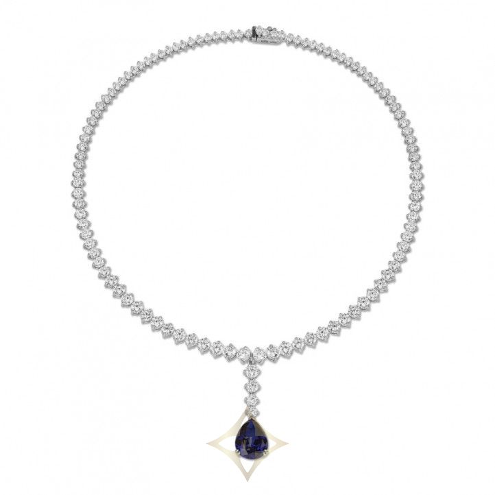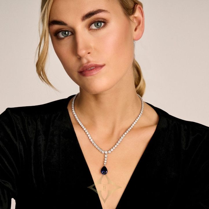 21.30 carat diamond gradient necklace in white gold with pear-shaped sapphire