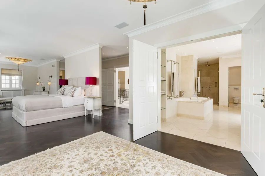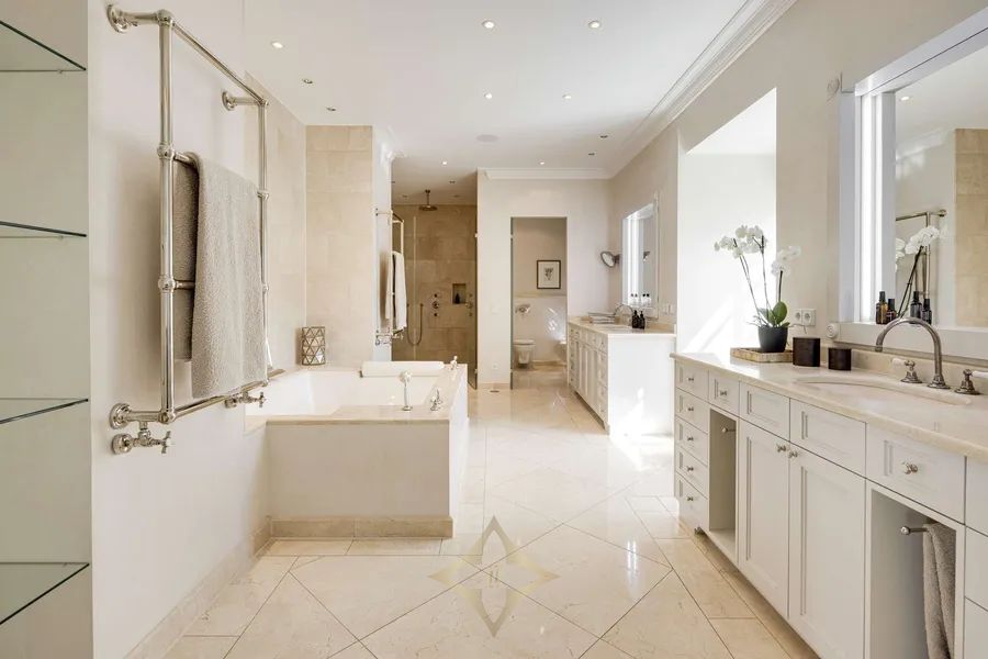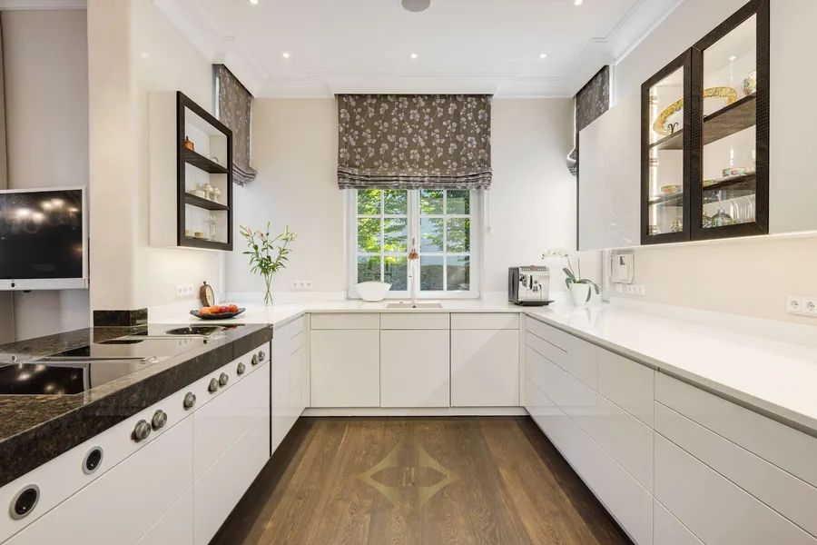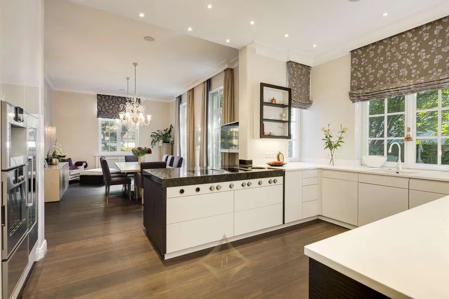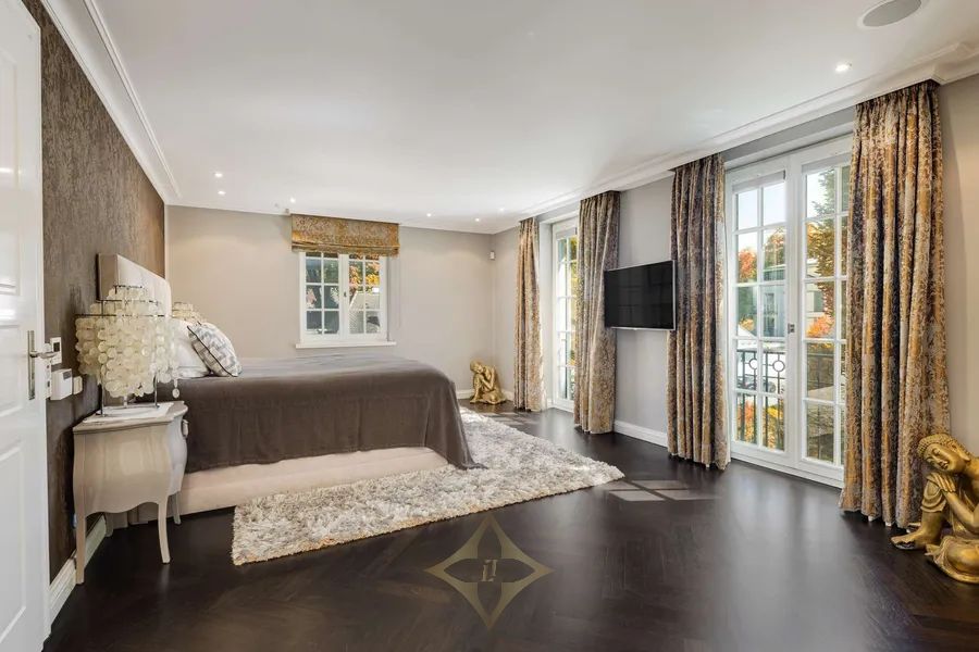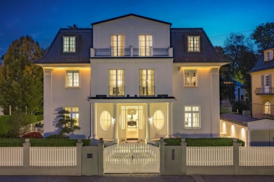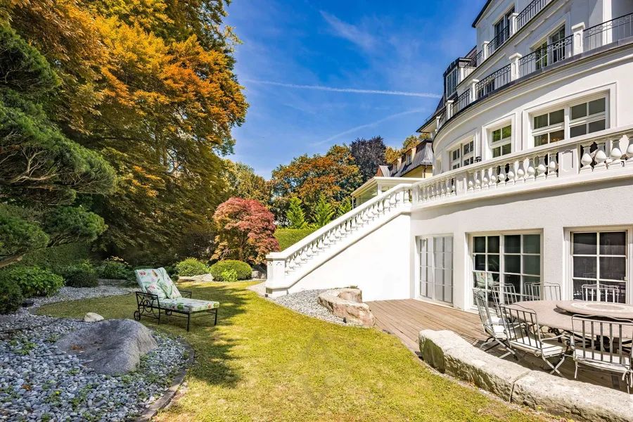 Pilaster strips and plaster flaps, white lattice windows, an impressive hipped roof with a central gable and an imposing entrance portal characterize the villa’s captivatingly beautiful architecture. The timeless elegance continues inside this luxury domicile. Light stone and dark oak parquet flooring, delicately tinted stucco lustro wall finishes and fine ceiling stucco in almost all rooms, numerous spacious custom-made fittings and exclusive, light-filled bathrooms create an absolutely high-class living environment.