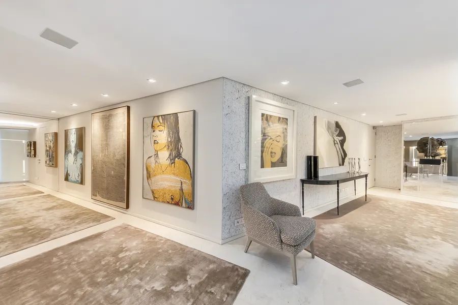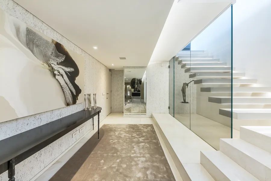 Upon entry, a sense of grandeur unfolds, soaring ceilings, curated lighting installations, floor-to-ceiling glass doors, and striking design elements such as floating staircases and select glass flooring, adding drama and flair throughout. Designed with entertaining in mind, the expansive living and dining spaces flow seamlessly onto a glamorous outdoor terrace. Here, a rim-flow pool reflects the endless horizon, setting the perfect backdrop for unforgettable gatherings.