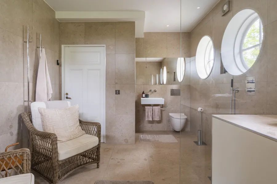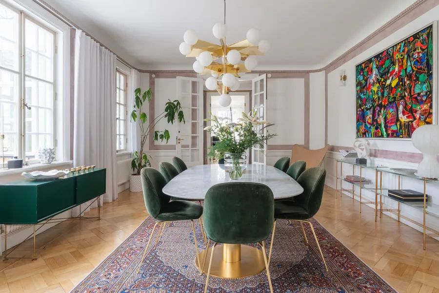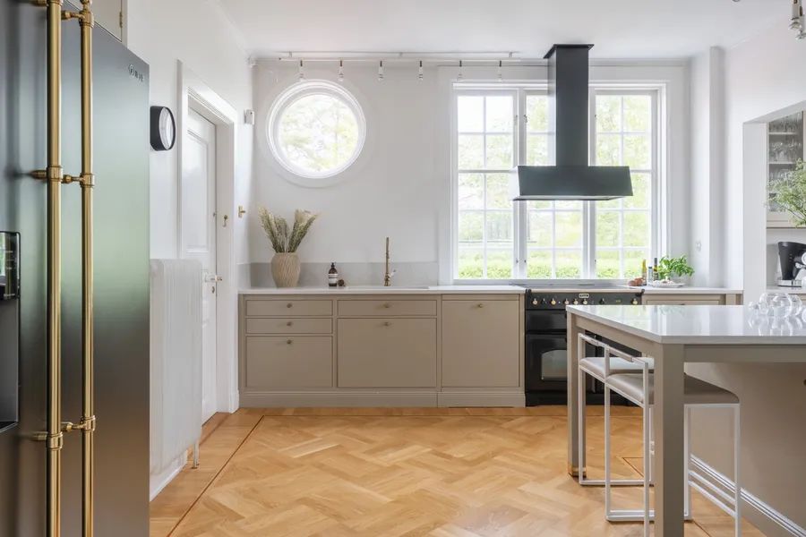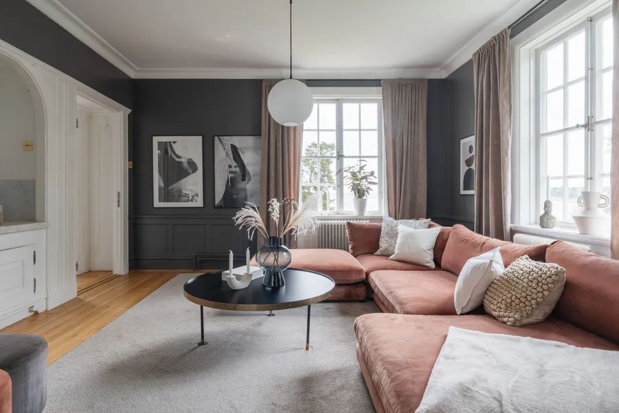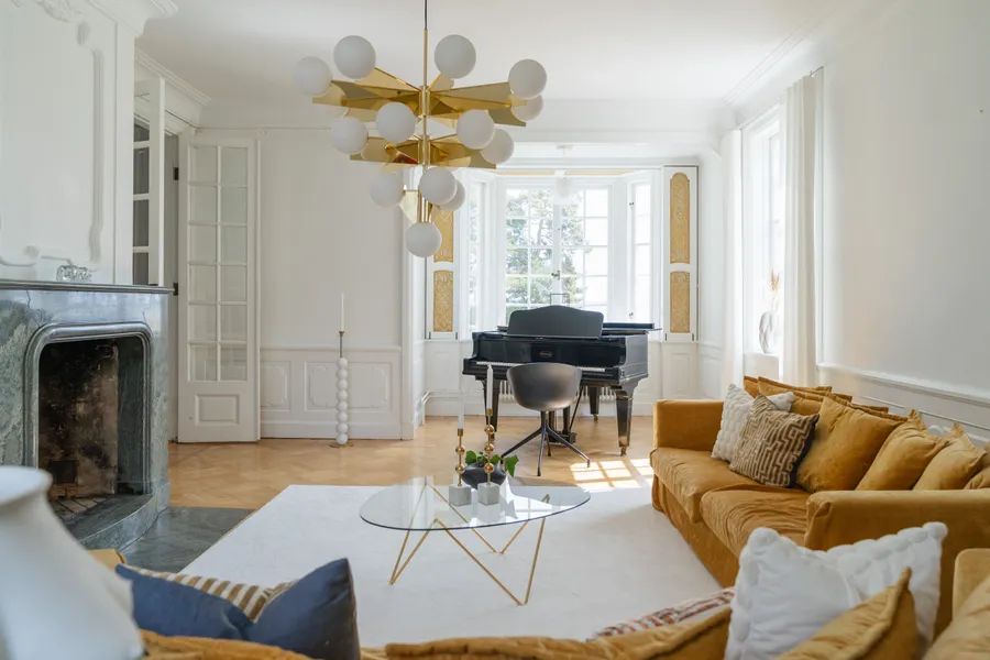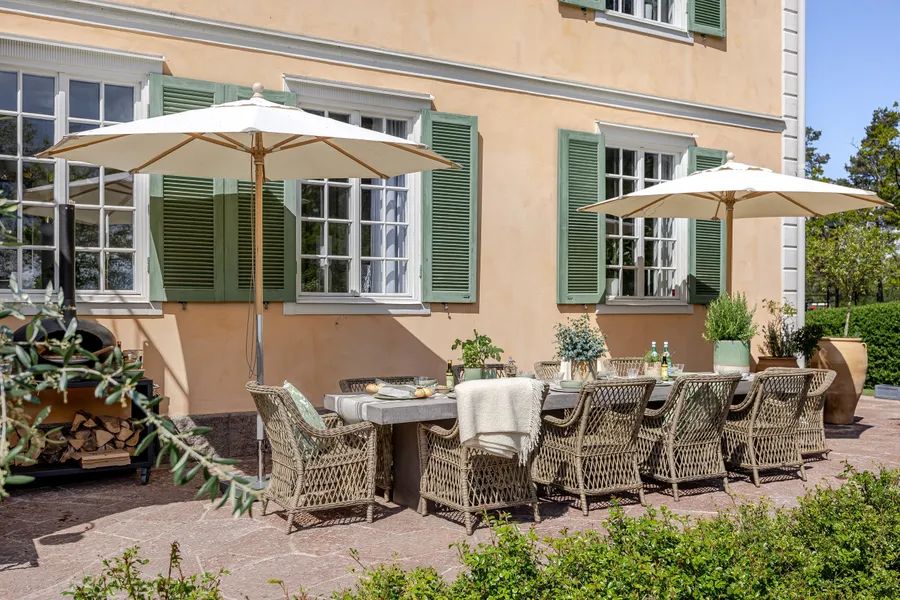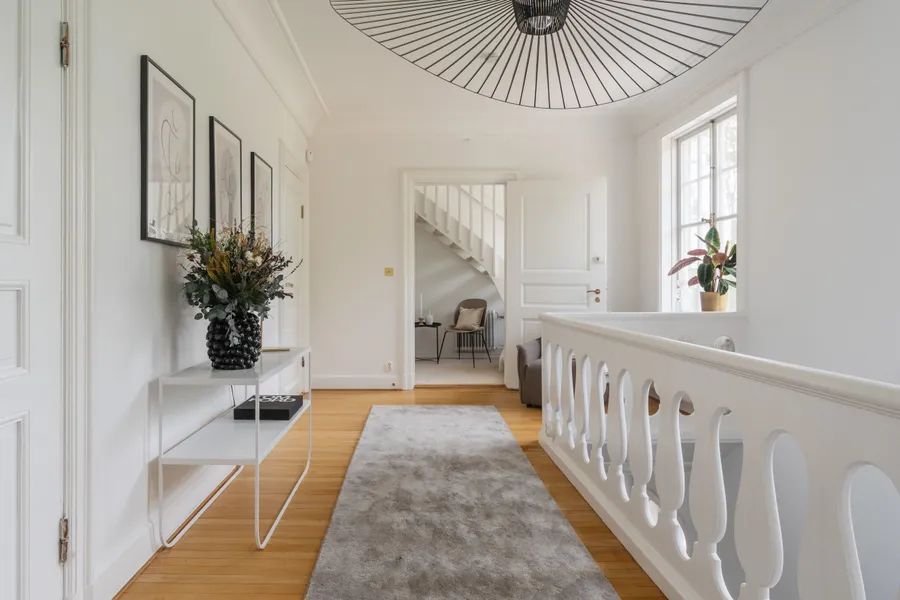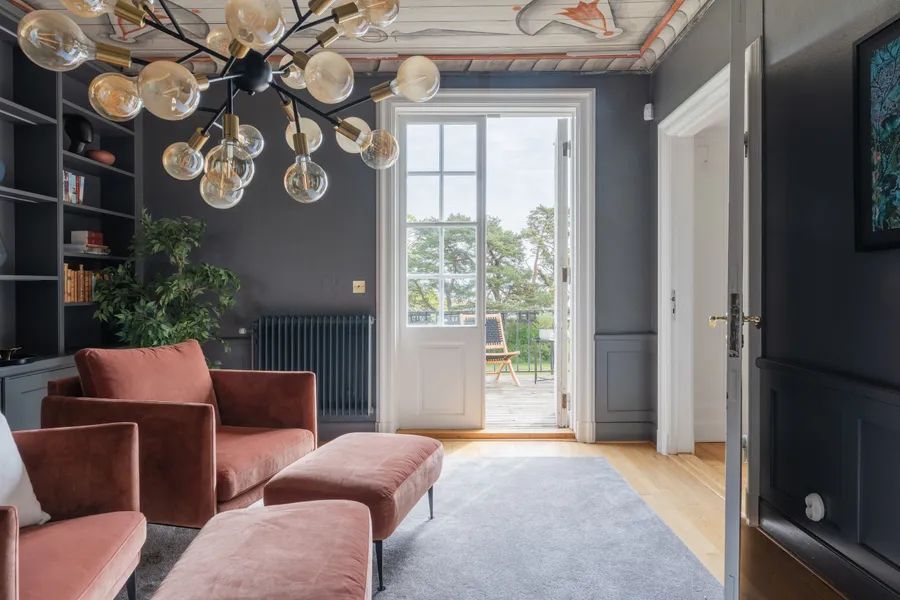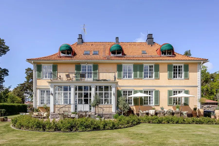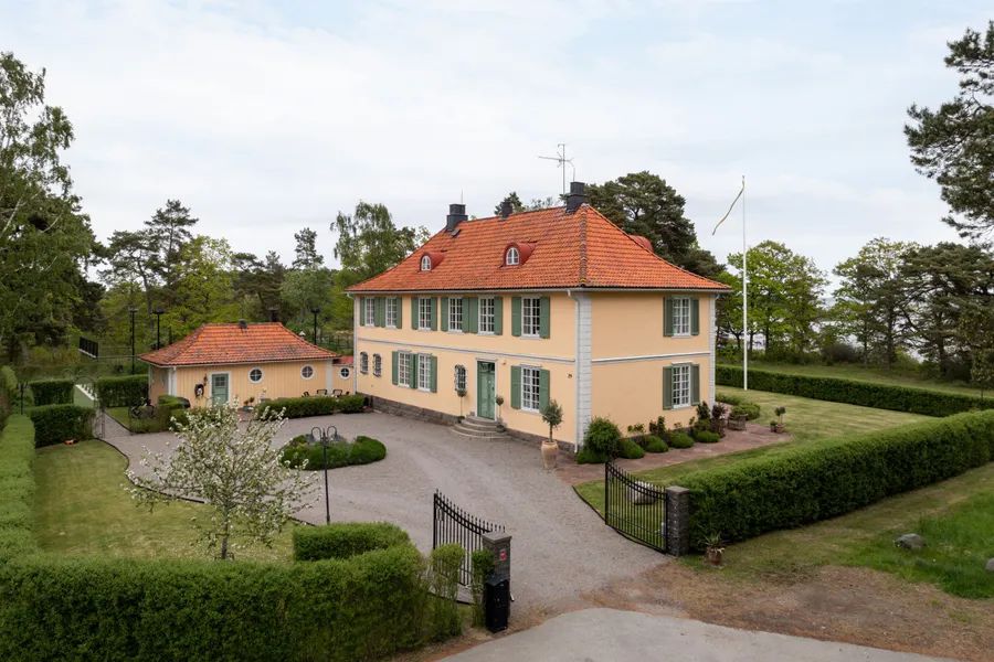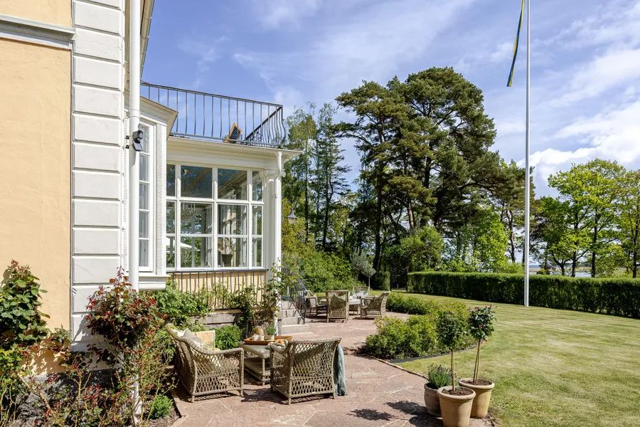 Upon arrival, the villa makes a striking first impression with a blooming roundel framed by towering trees. The house rests on a foundation of cut granite, and the entrance is reached by a semicircular granite staircase leading to a paneled door with Rococo-inspired curves. The porch ceiling is adorned with painted decorations in harmonious patterns. Inside, the hallway draws your eye straight through the house to the sea. Daylight filters through the mullioned windows reflecting on the original painted ceilings, faux-marble finishes, and limestone flooring. The dining room and salon, with views of the strait, boast paneled wainscoting, coffered ceilings, and original tiled stoves – preserved artworks from the Oskarshamn tile factory. A charming sunroom extends the home toward the water.