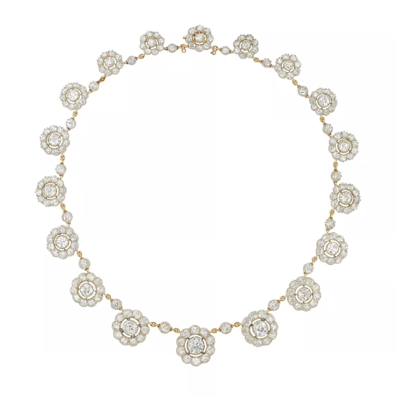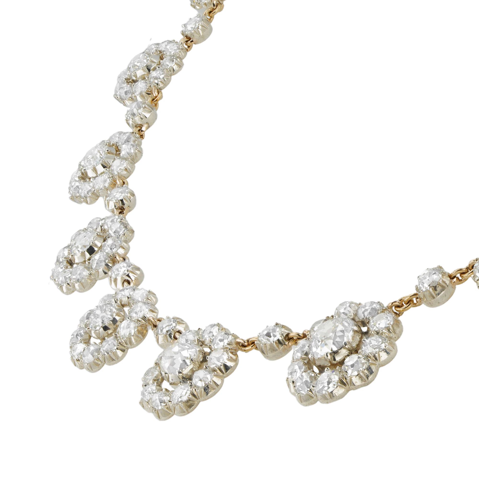 An important Victorian diamond cluster necklace, consisting of eighteen diamond-set clusters graduating is size from the centre, connected with gold trace chain embelished with eighteen single diamond-set collets in-between, the central diamond estimated to weigh apprximately 2 carats and the total combined weight of the diamonds including the central one estimated at 44 carats, all cut-down set in silver with gold back and gold hidden clasp, circa 1880, measuring approximately 43 x 2cm, gross weight 41.7 grams.